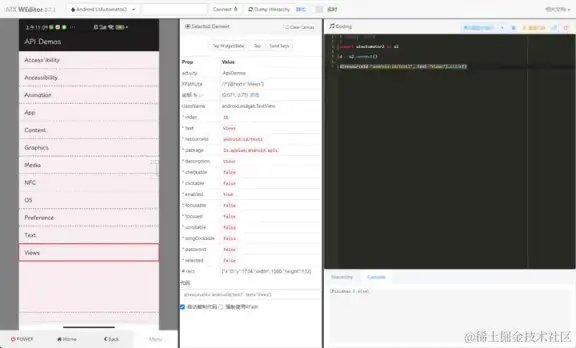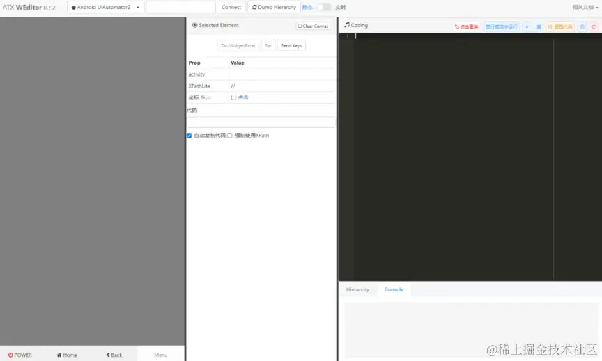 - 代码运行:功能:用于执行对元素的交互动作,并自动生成相应的代码记录。交互:用户可以通过左侧的代码运行期执行元素的交互动作,并利用以下选项进行代码的执行和管理:单行或选中运行:选择具体需要运行的某行代码。运行按钮:连接设备运行选中的代码。结束运行:中断当前代码的执行。删除、重置代码:清空已有的元素交互代码。复制代码:方便复制代码框的内容。重启服务:将代码的运行状态重置到初始值。Hierarchy:展示设备的界面元素结构,便于更全面地了解应用程序的层级结构。Console:显示控制台日志,提供开发人员调试和信息记录的途径。
