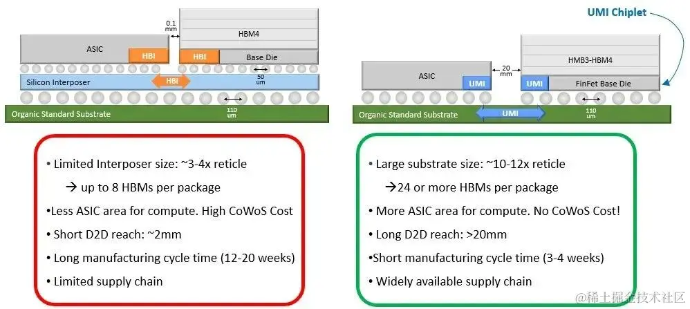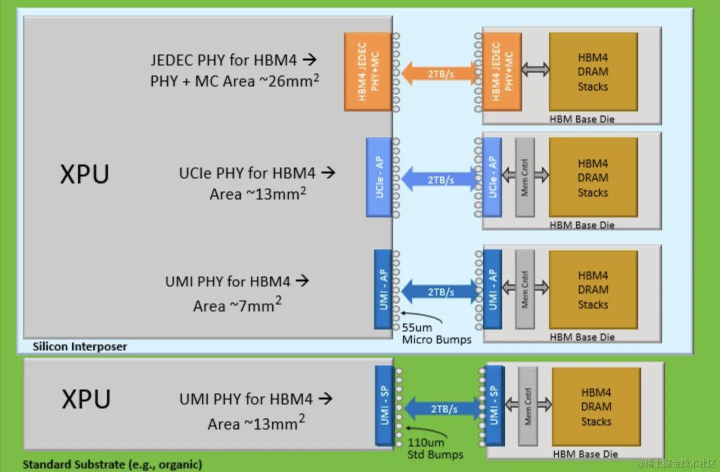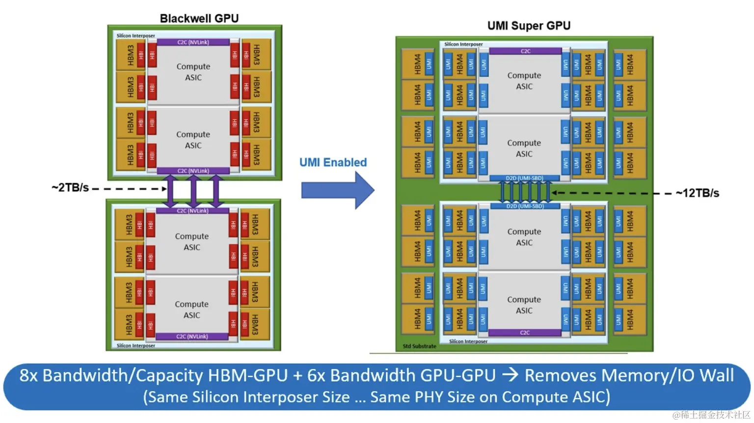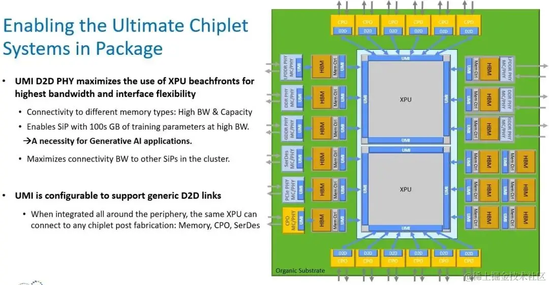但这还不是全部。这种UMI方法适用于任何XPU以及任何类型的内存,你可以在一个庞大的有机基板上进行类似的尝试,而无需中介层。