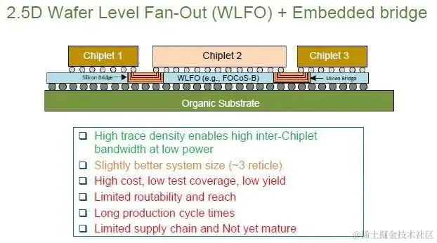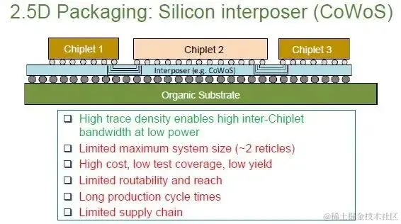 使用这种2.5D封装技术,可以制造一个尺寸约为三个掩模单元的封装包。高密度的走线意味着我们可以在低功耗下获得更高的芯片间带宽,但其连接范围受限,走线布线的路由能力也受到限制。实际上,这一技术还没有得到真正的大规模推广。