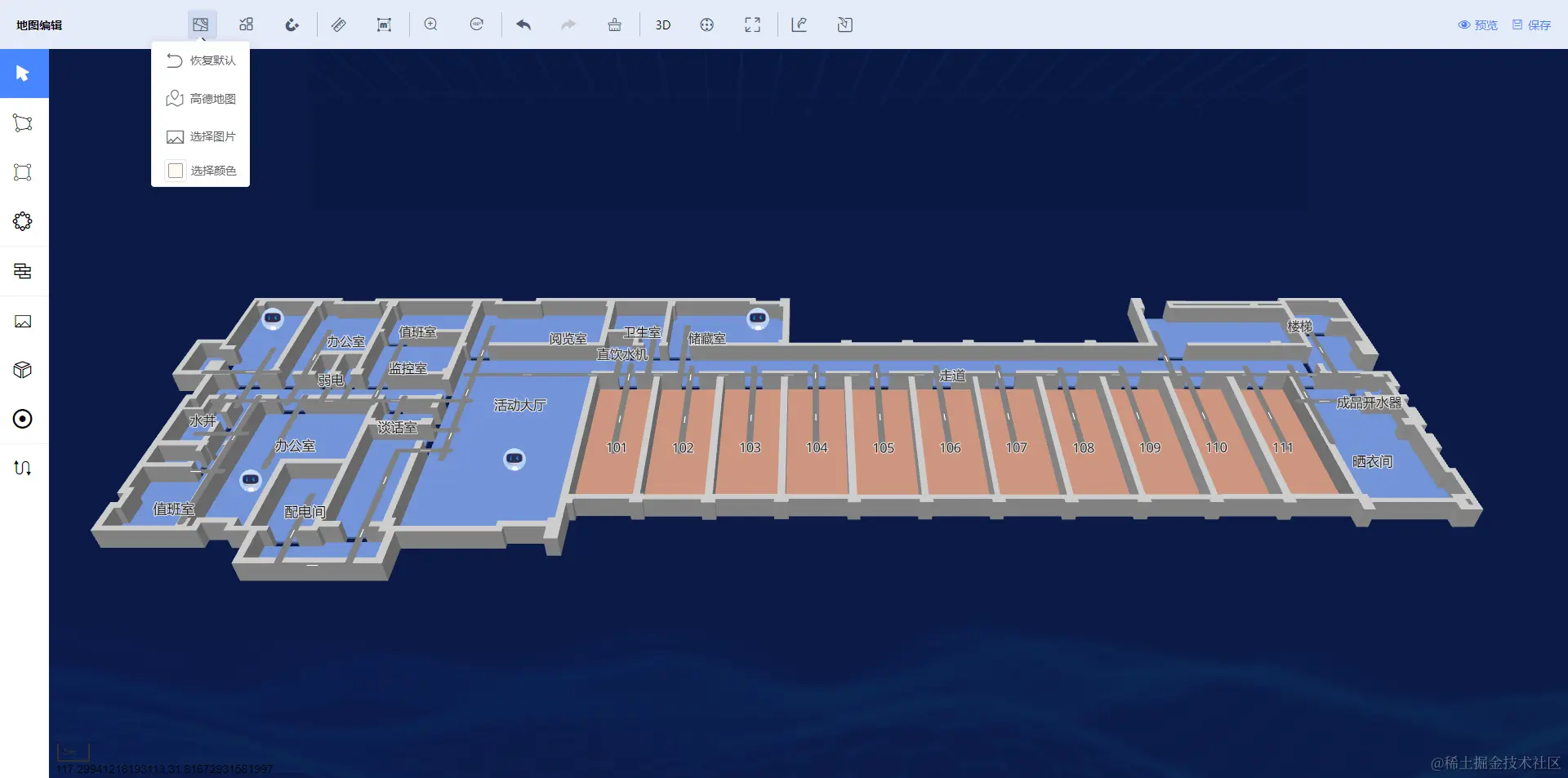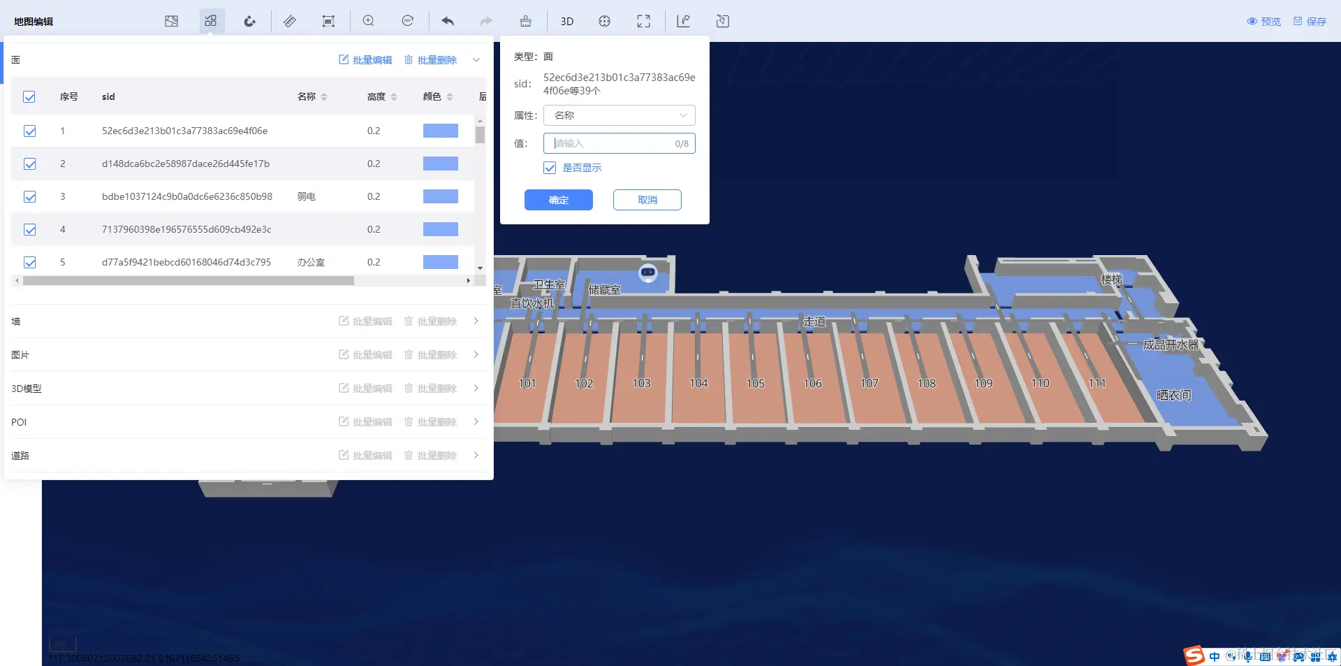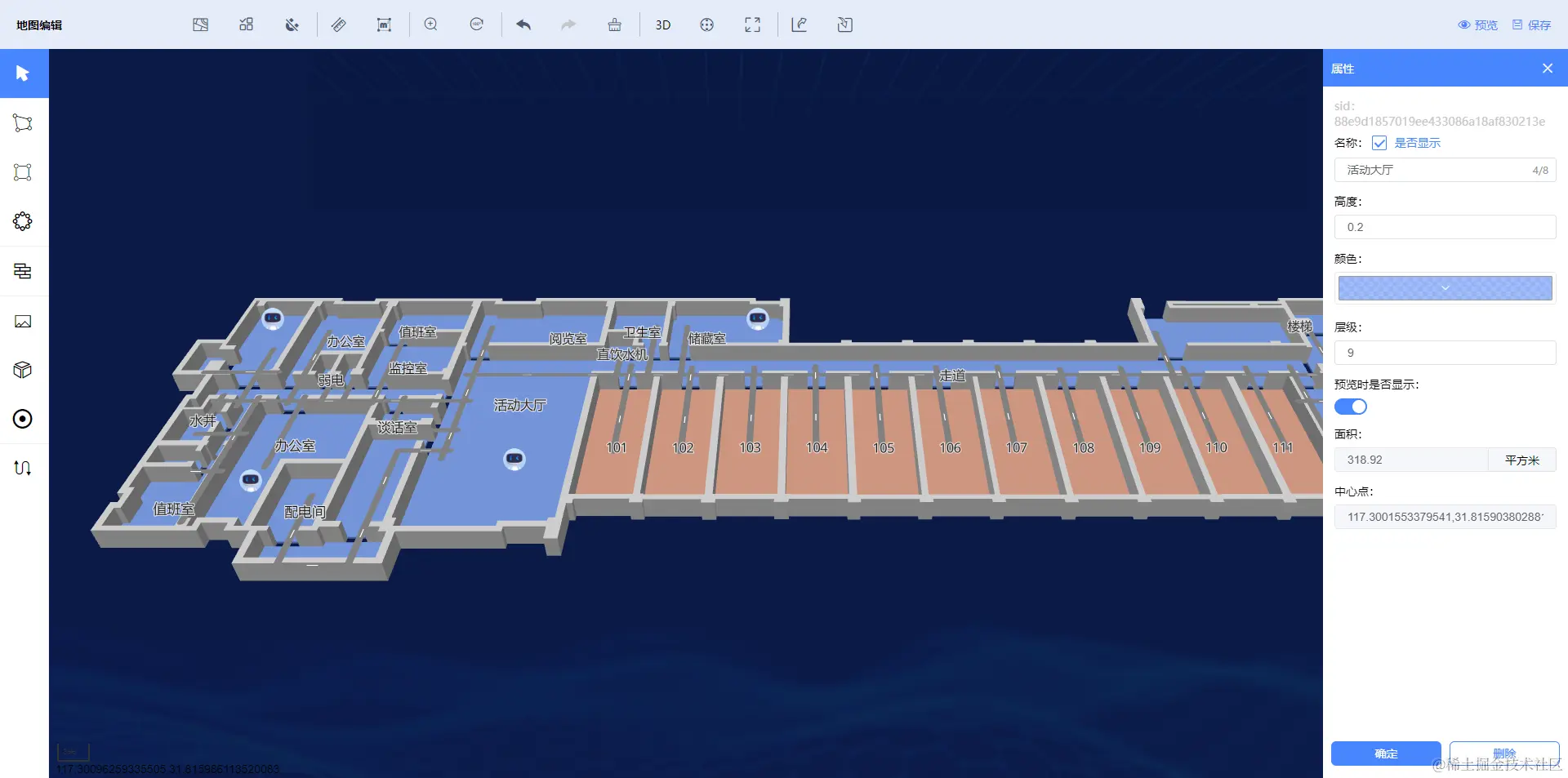 纯前端实现的室内地图制图编辑器,包含控件栏、工具栏、地图绘制区及属性编辑栏,可进行基础的3D地图绘制、炫酷的3D模型加载以及纯前端实现的路径规划等。业务对接方便快速,可满足不同成本的用户需求。