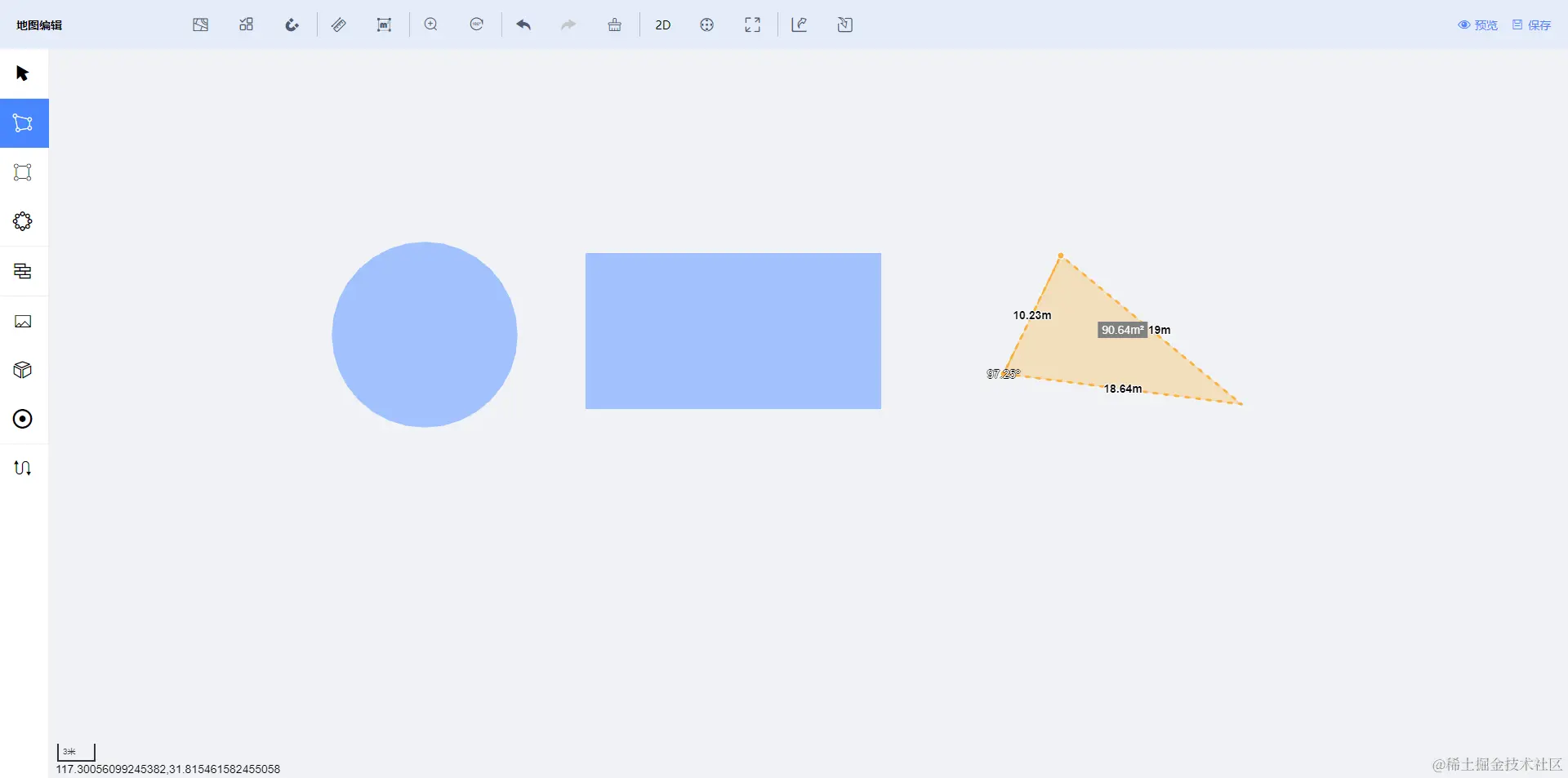 多边形、矩形、圆形编辑器,绘图时可显示距离、面积、角度等信息