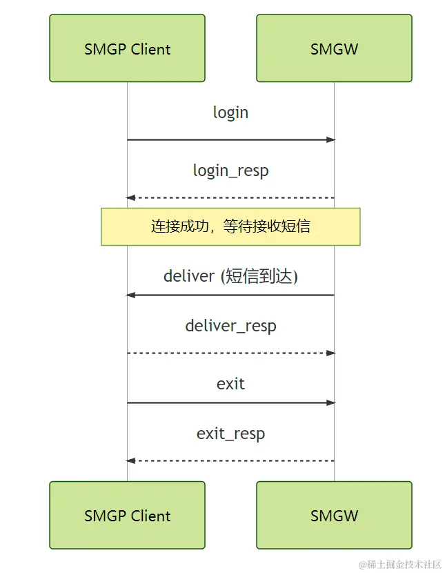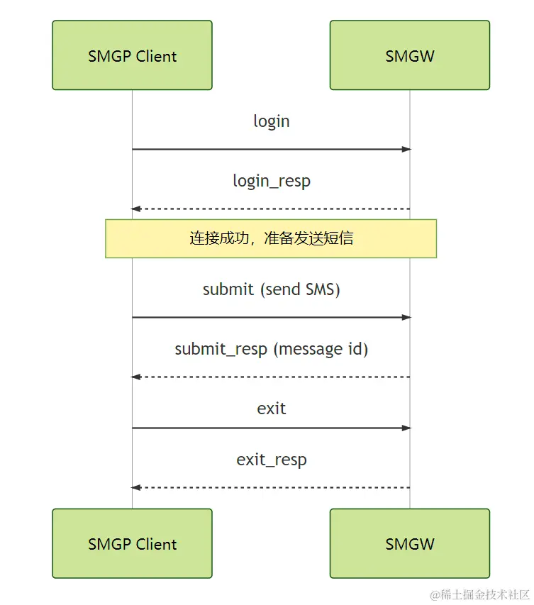 SMGP 协议基于客户端/服务端模型工作。由客户端(短信应用,如手机,应用程序等)先和短信网关(SMGW Short Message Gateway)建立起 TCP 长连接,并使用 CNGP 命令与SMGW进行交互,实现短信的发送和接收。在CNGP协议中,无需同步等待响应就可以发送下一个指令,实现者可以根据自己的需要,实现同步、异步两种消息传输模式,满足不同场景下的性能要求。