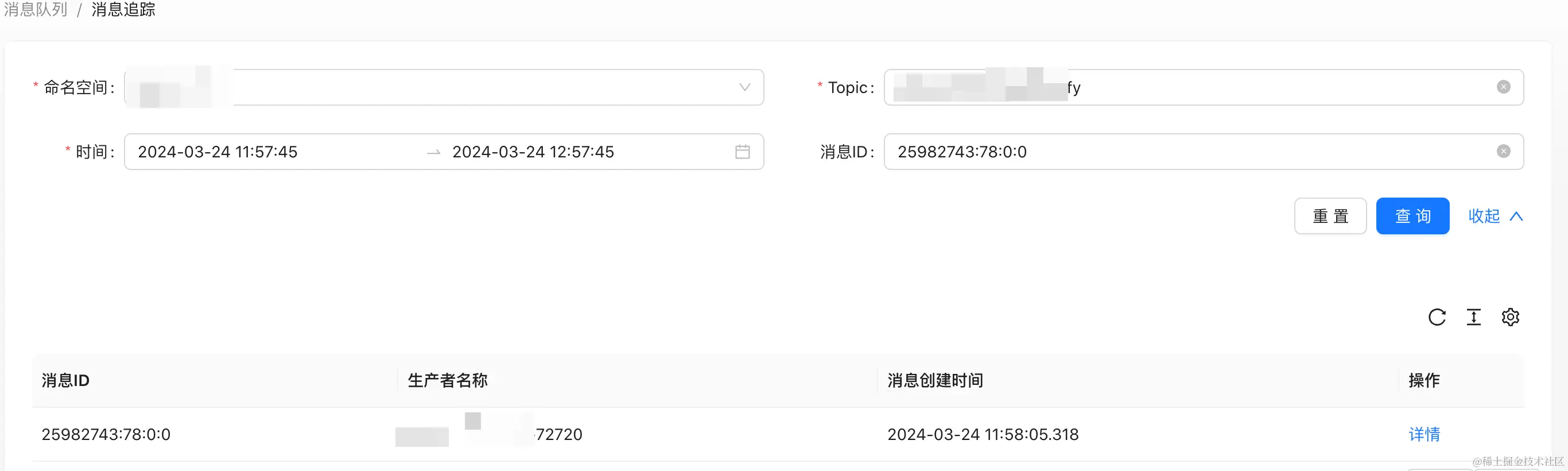 再通过这条消息的 id (为了演示,这里的 messageId 可能不一样)在我们的 pulsar 消息链路系统中找到了消息的发送链路: