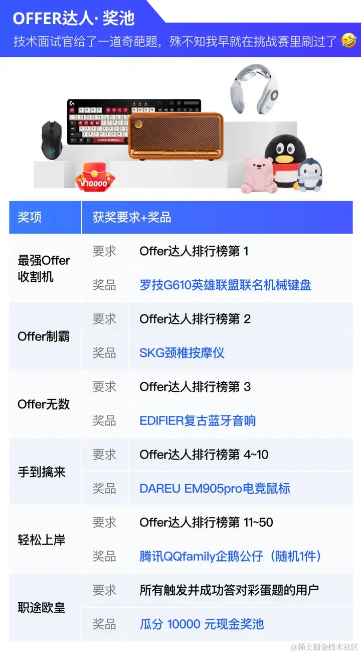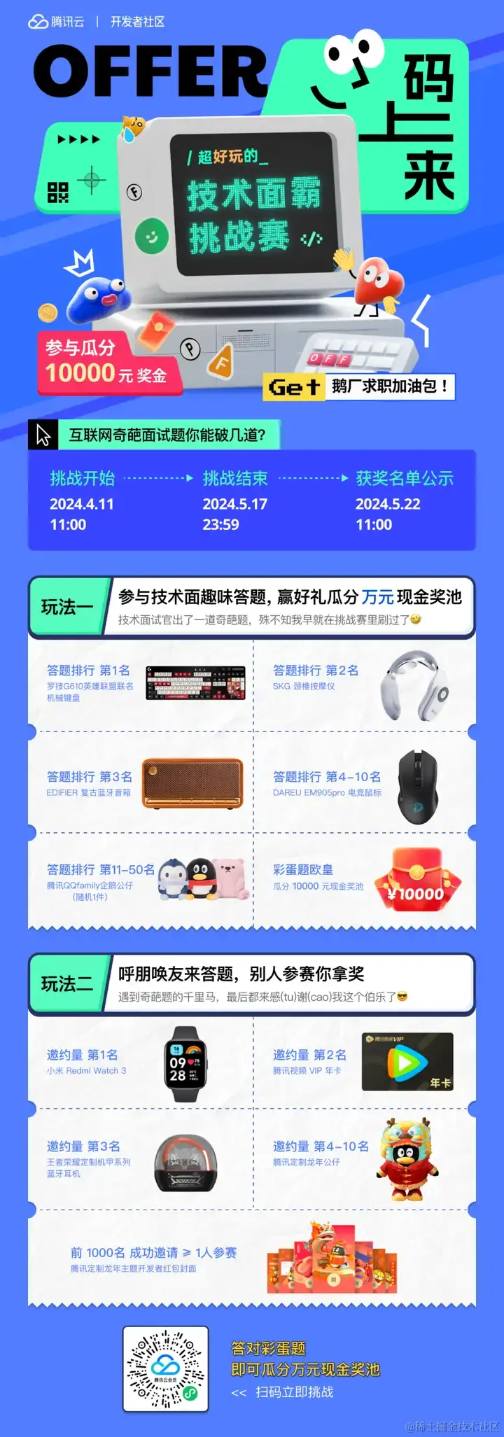 腾讯云开发者社区重磅推出「Offer 码上来」超好玩的技术面霸挑战赛,汇集各路有趣上天的技术面奇葩题,邀你来挑战答题一战高下,看谁能夺得“Offer 收割机”桂冠。本次赛制升级,参赛人人皆有机会最终瓜分10000元现金奖池!更有罗技机械键盘、智能手表等上千件鹅厂好礼等你来赢。