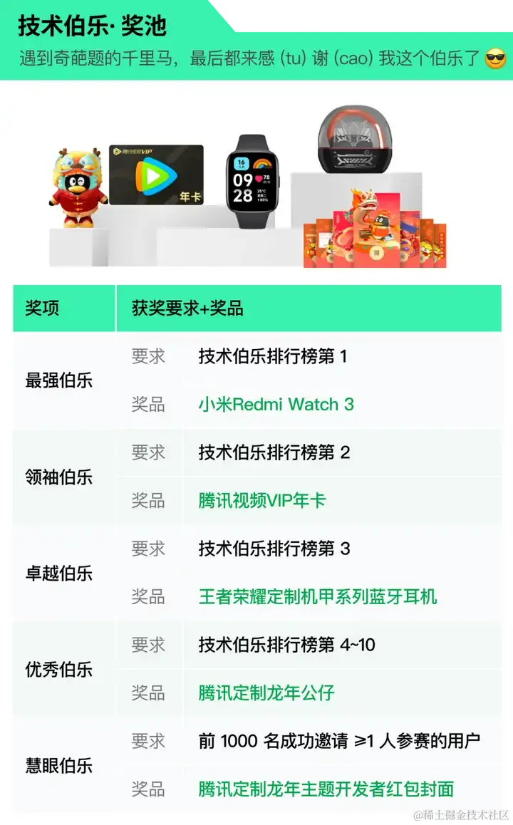 - 活动期间点击「邀人参赛」,可生成您的专属邀请海报。通过您邀请成功参与答题的人数及其受邀时间,将依次影响您在「技术伯乐排行榜」的排名。