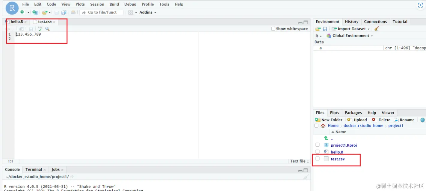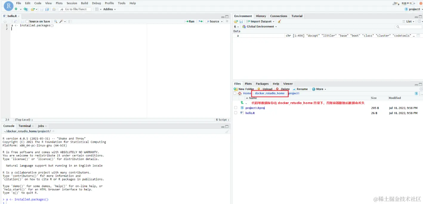 推荐进入R Studio后,马上新建一个项目,然后将项目数据保存到docker_rstudio_home目录下,否则容器删除后,数据会丢失。