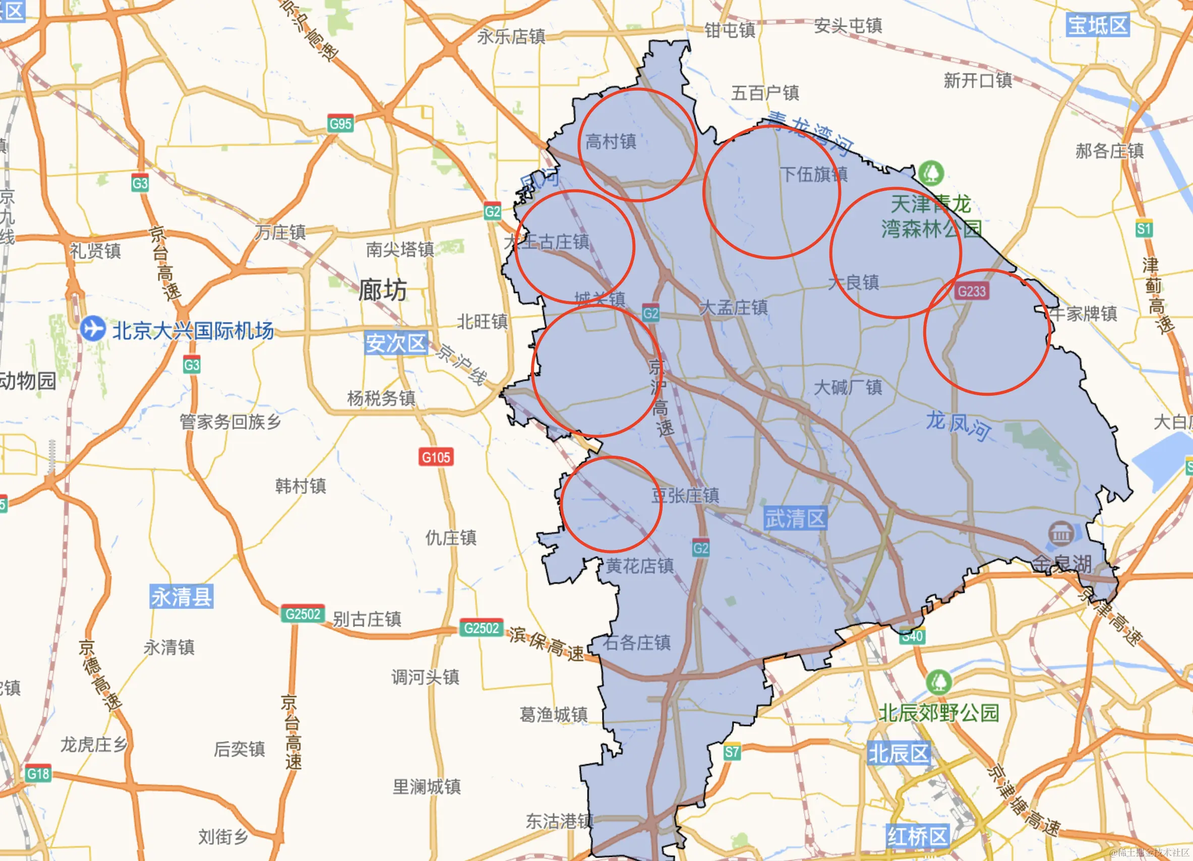 那就是要切割了,如下是天津市-武清区,如果希望对于武清区解析的更准确就要增加武清区数据,数据不能是随意添加,需要如下图这样的画圈,将武清区的边界画出,增加这些圆圈中心坐标数据。如果希望更加精细就要画出更多直径更小的圈,不过那工作量将非常庞大。