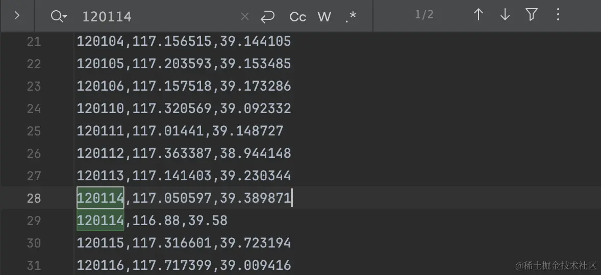 2、在areas_with_geo.csv文件中补充120114经纬度120114,116.88,39.58。