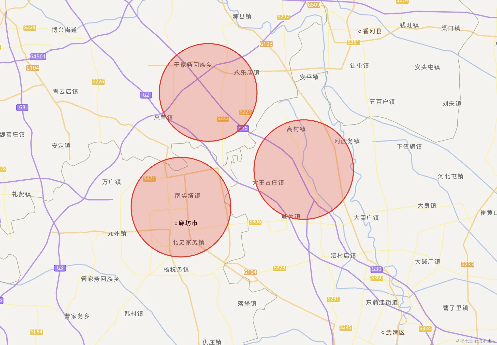 如下图在北京通州、天津武清、廊坊广阳邻接的位置画了三个圈,其中天津武清区的圆心坐标为:116.88,39.58,北京通州圆心坐标为:116.91,39.59,廊坊广阳圆心坐标为:116.70,39.54。