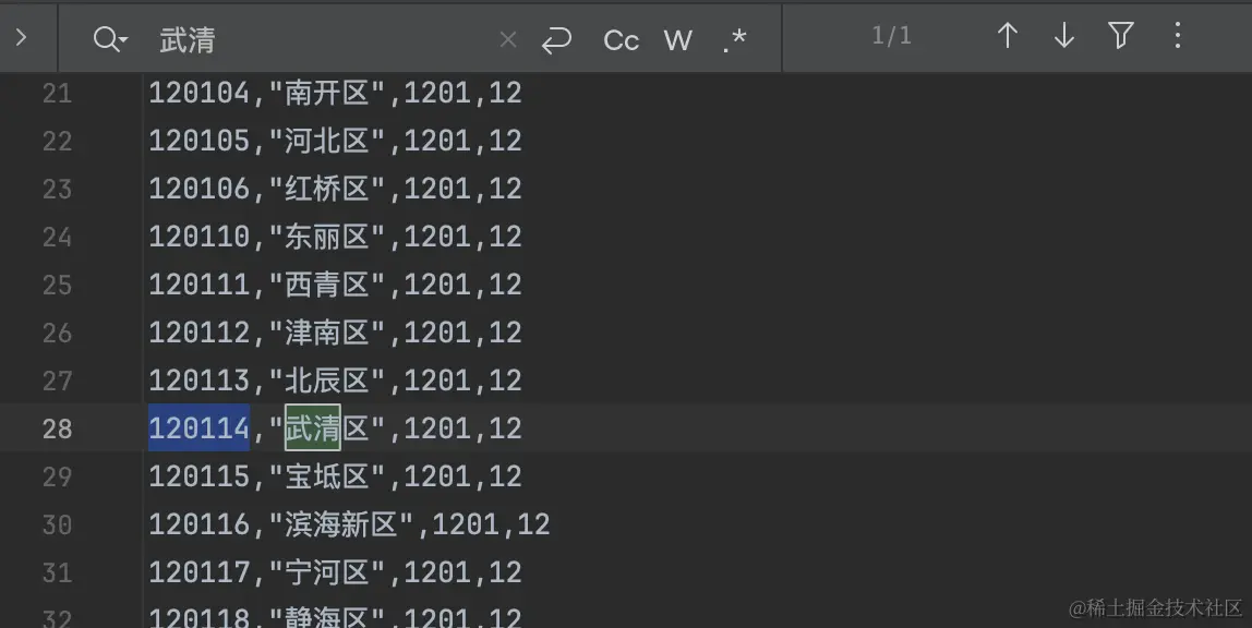 1、首先从areas.csv文件中找到武清区的areaCode为120114。