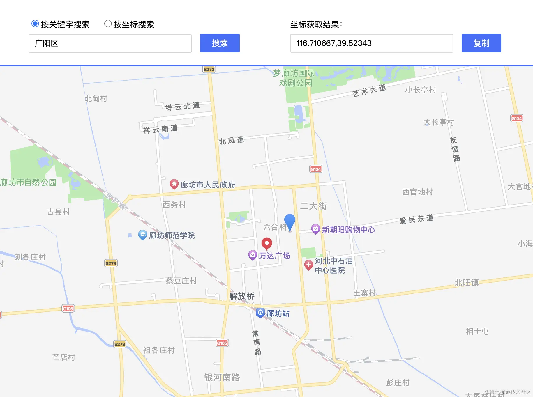 现有坐标:116.867584,39.542294,其应该归属天津市-武清区,但是因为计算方法或者说是数据的缺陷,因此此点离廊坊市-广阳区更近,所以结果是pcaByGeo:Pca(province=河北省, city=廊坊市, area=广阳区),并不正确。如下图所示。