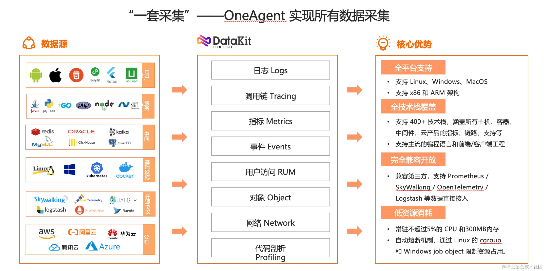 - 在数据采集端,通过"One Agent"方式,简化了数据采集配置及安装,减少资源占用;