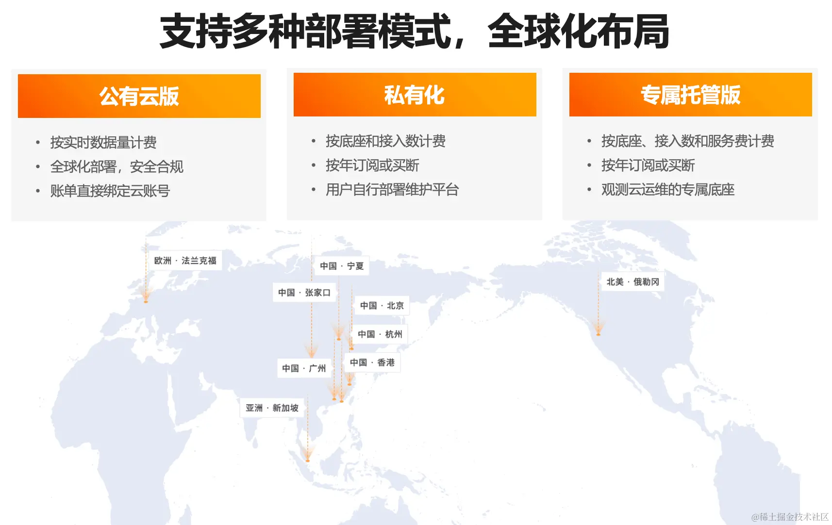 相比于 ELK ,观测云的服务提供方式就灵活很多了,目前提供的三种接入方案中,首推用户使用 SaaS 服务接入观测数据,这样可以以较少的费用支出,实现系统全链路可观测体系的建立。后期随着数据规模的增长,如希望进一步优化海量数据的存储成本,可考虑采用私有化输出和云上专属托管的方式,建立用户私有的观测云技术栈。相比于 ELK Cloud 版本,观测云私有化输出版本的成本也有着比较大的优势,尤其是在超大数据规模下,通过观测云的冷热分离版本,综合性价比可以做到将近 10 倍。通过 SaaS + 私有化的交付方式,可以为用户可观测平台的选型提供更多灵活性。