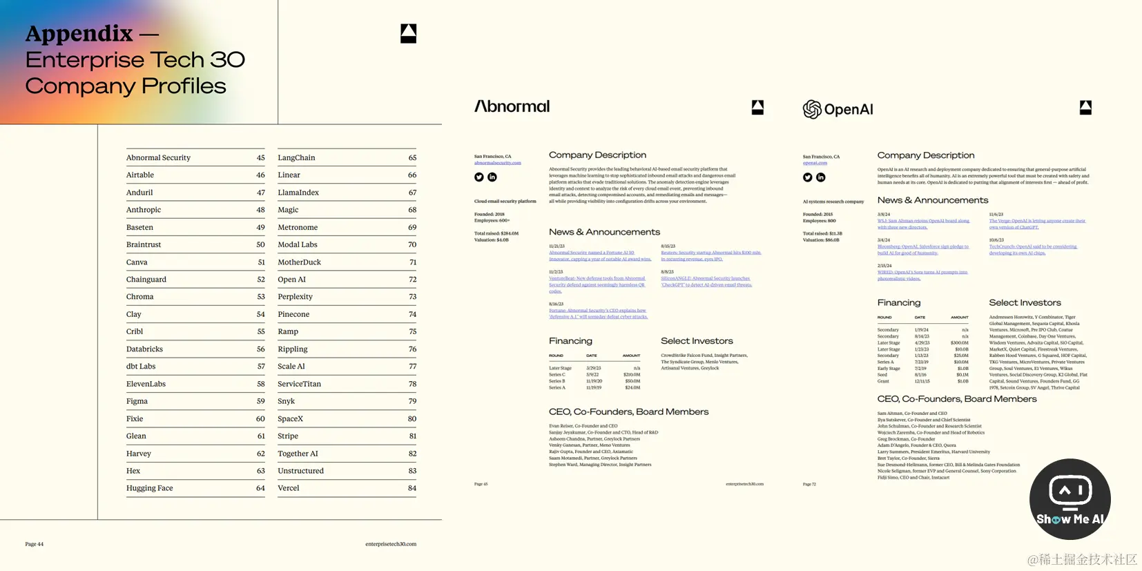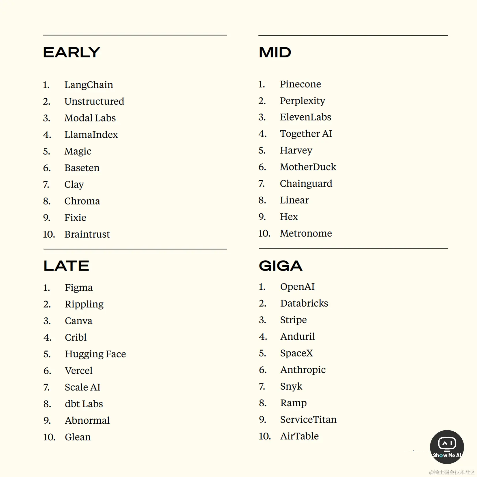 - 约 50% 的上榜公司与AI模型、工具、数据等有关,表明行业正在为下一代应用的爆发积累基础和推动力。