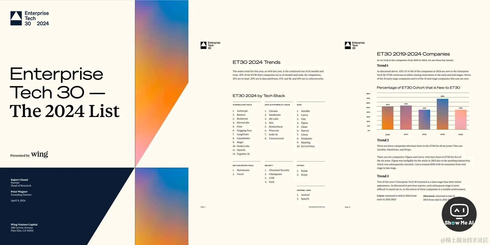 5月初,Wing VC 释出了最新的 2024 年「Enterprise Tech 30」榜单和报告。总榜如下,报告中还有很多细分榜单和详细的数据解读,信息密度很高。。