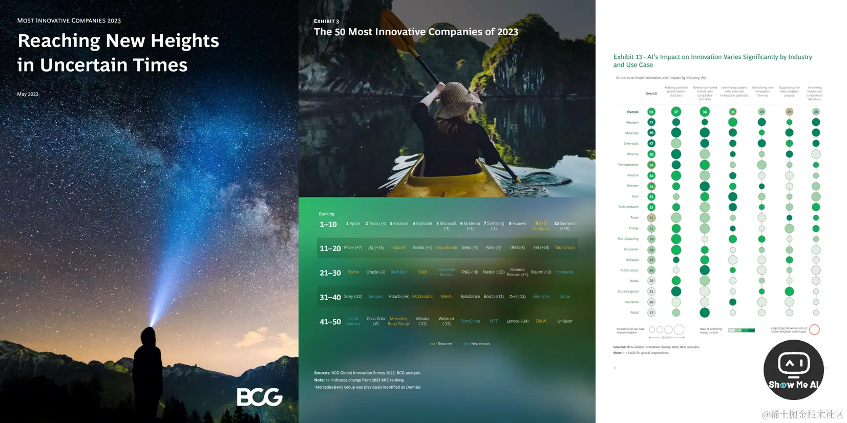 BCG每年都会发布一份年度创新报告,评选出当年最具创新力的 50 家公司,探讨新入选公司脱颖而出的原因,并分析榜单上这些公司的创新特质。目前最新的报告是 2023 年的 。