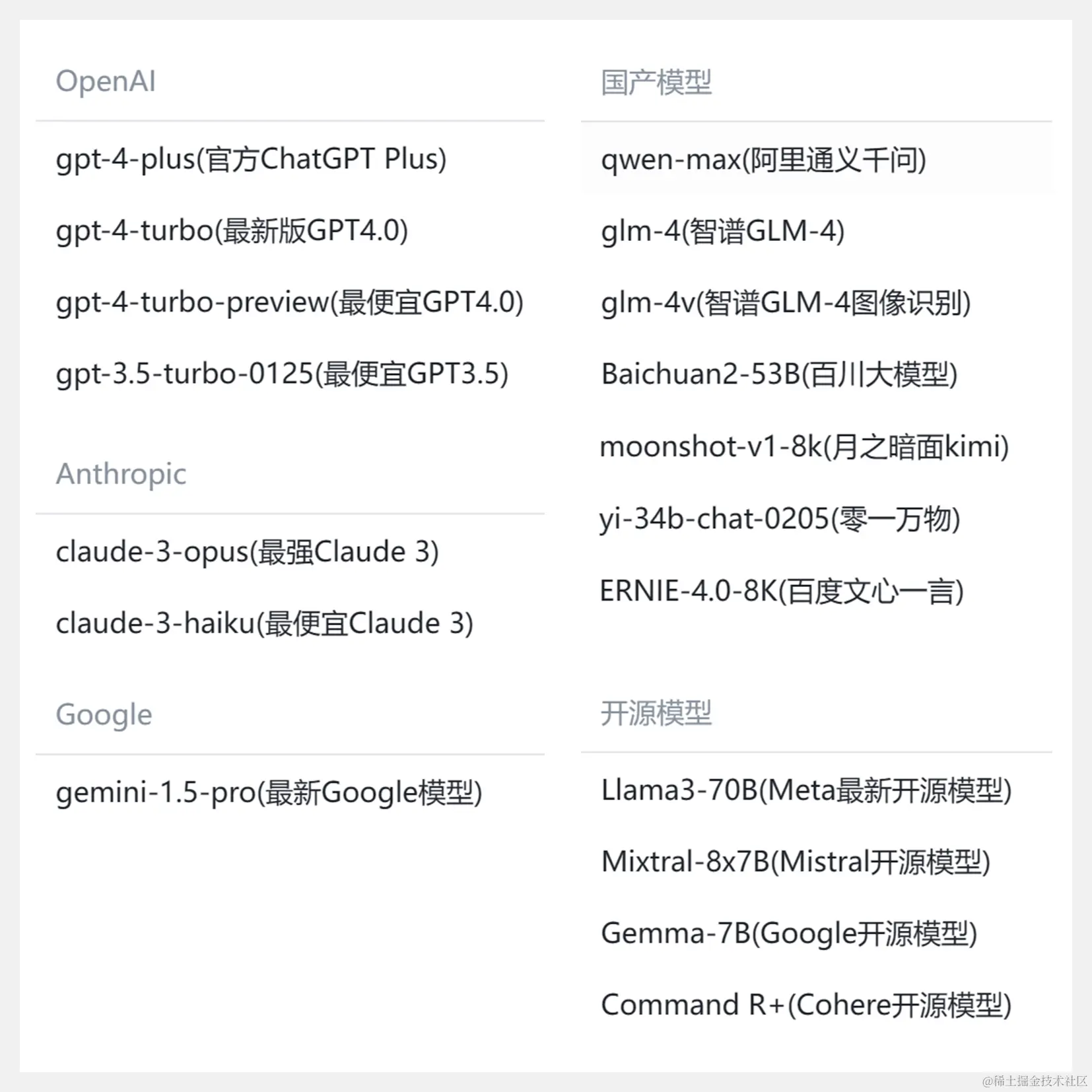 可以看到,从 OpenAI 最新的 GPT-4,到现在很火的 kimi moonshot,再到长文档能力超强的 Claude 3,可以说是应有尽有。