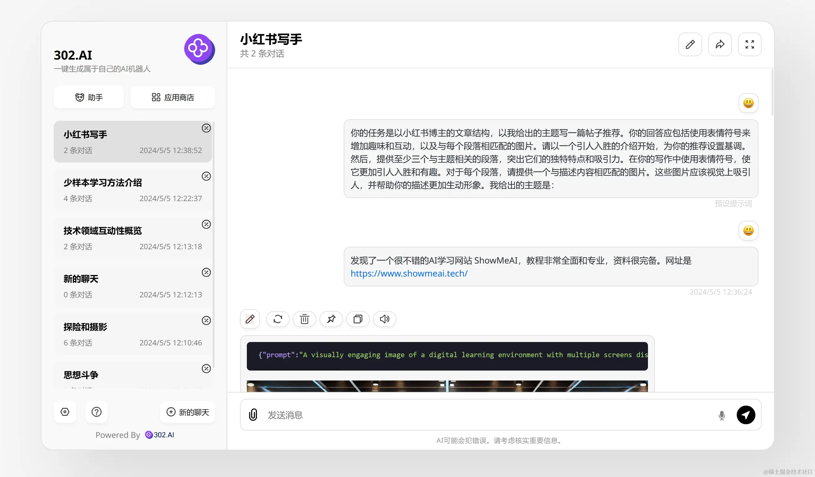 比如这个「小红书写手」助手,配置了一段默认提示词,可以根据你输入的主题生成小红书图文。