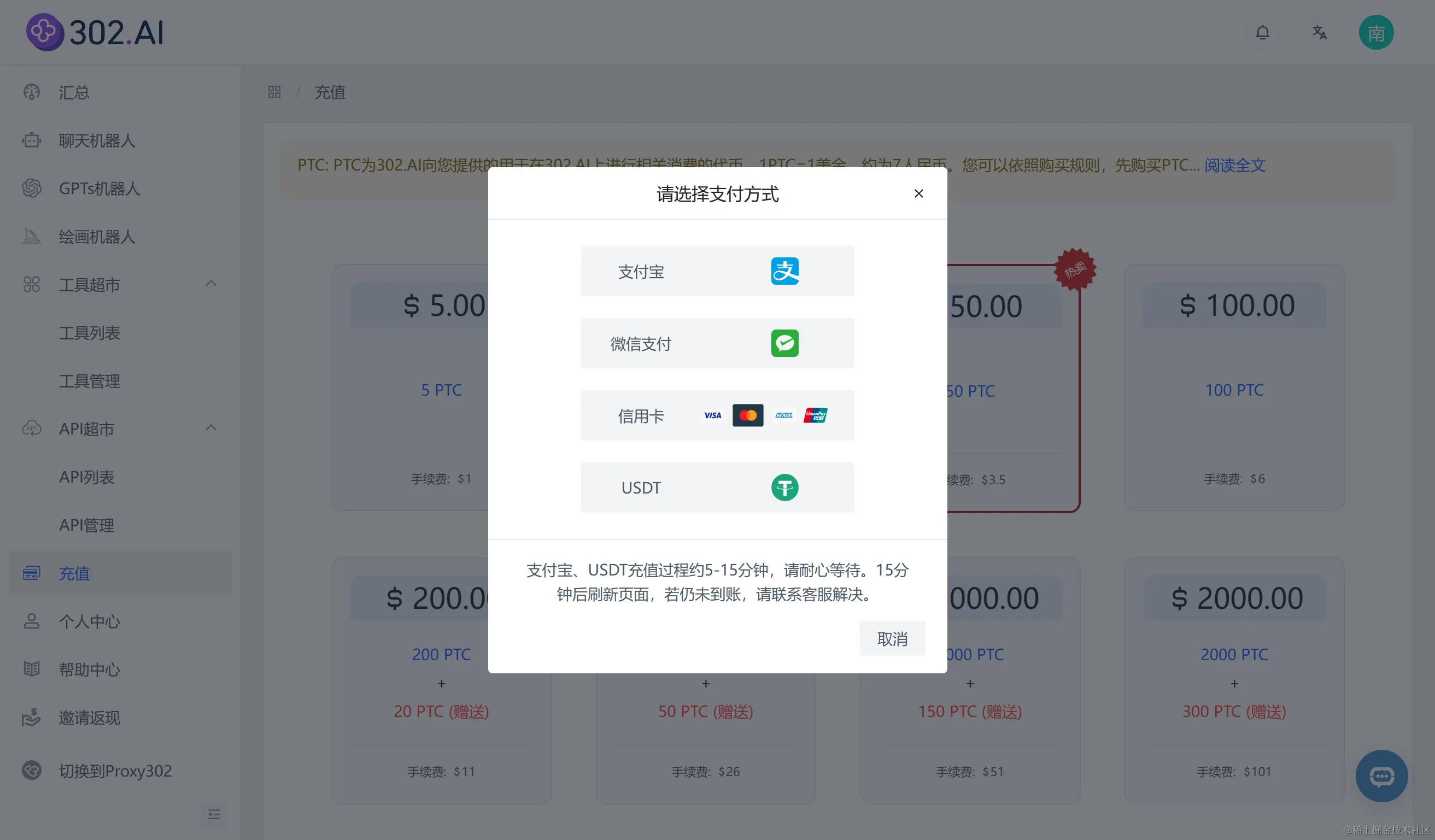 注意,302.AI 网站的计价单位是 PTC,你可以理解为 1PTC = 1美金。充值是购买 PTC 额度,另外需要支付约 5% 的手续费。