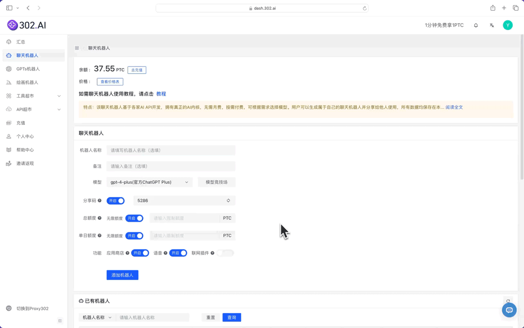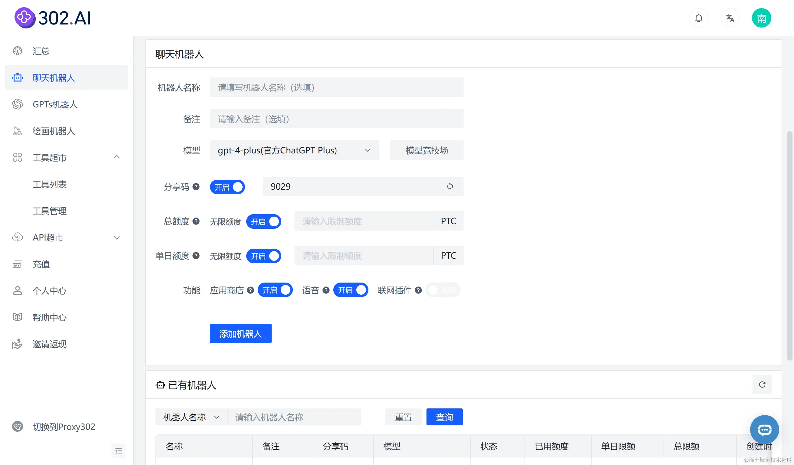 可以看到,管理后台主要包括5个部分:聊天机器人、GPTs 机器人、绘画机器人、工具超市、API 超市。