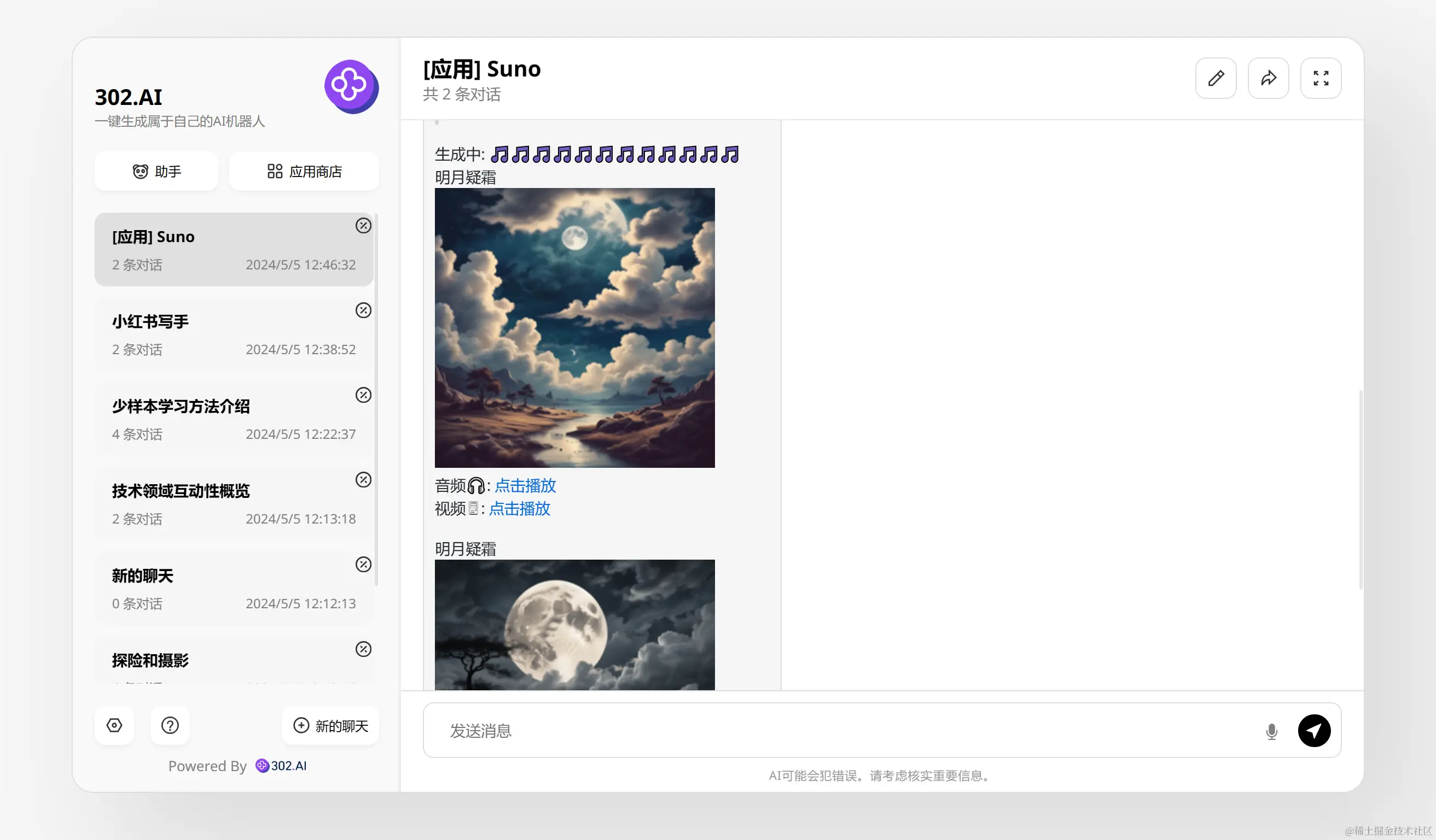 再比如最近超级火爆的AI音乐生成应用 Suno,也可以在 302.AI 里随时使用。