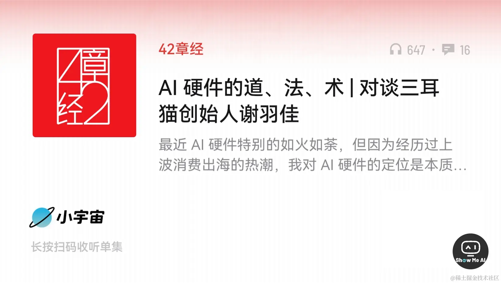 正好 42 章经最新播客也讨论了「AI硬件」这个话题。嘉宾谢羽佳是一位经验非常丰富的实战派,不仅帮我们破解了AI硬件领域近期热度飙升的原因,以及AI在消费电子行业的应用和发展趋势,还分享了很多操作细节,从业者一定要去听播客!