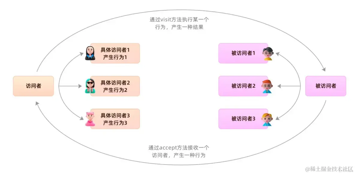 - 在不改变对象结构的前提下,定义作用于对象结构中的各元素的操作。