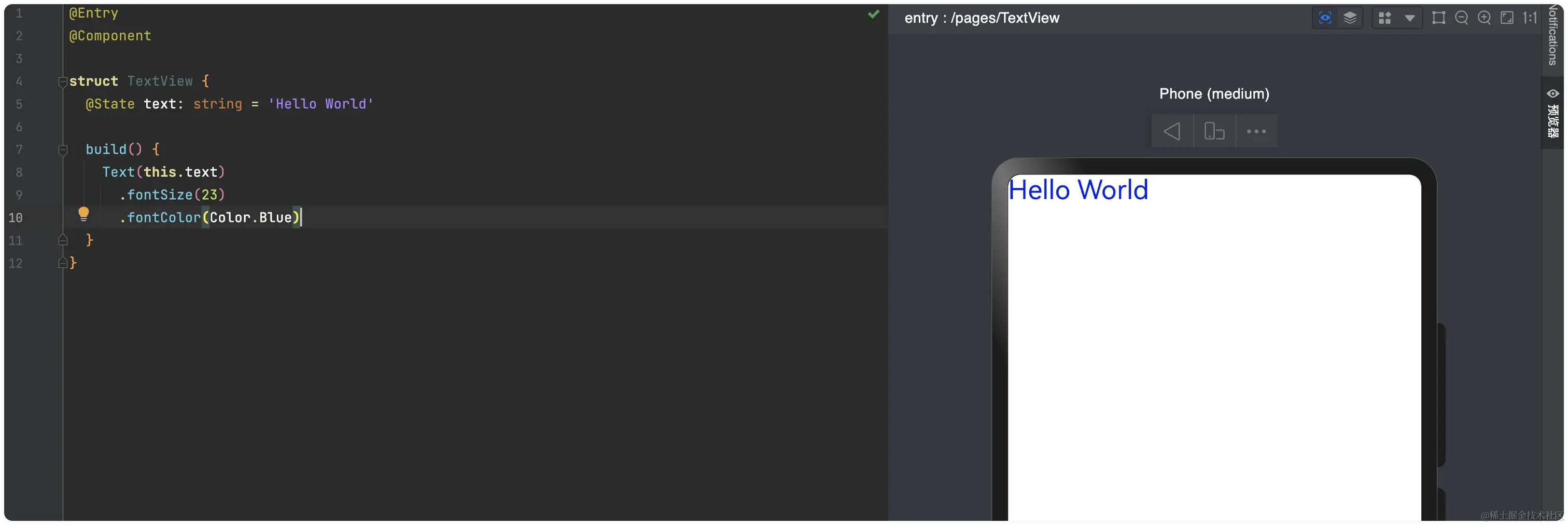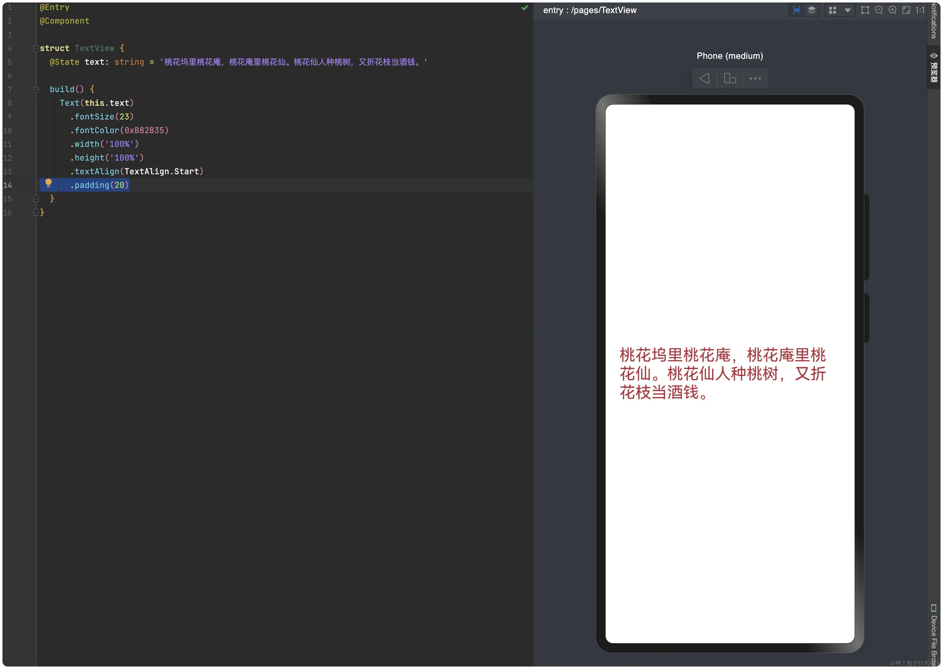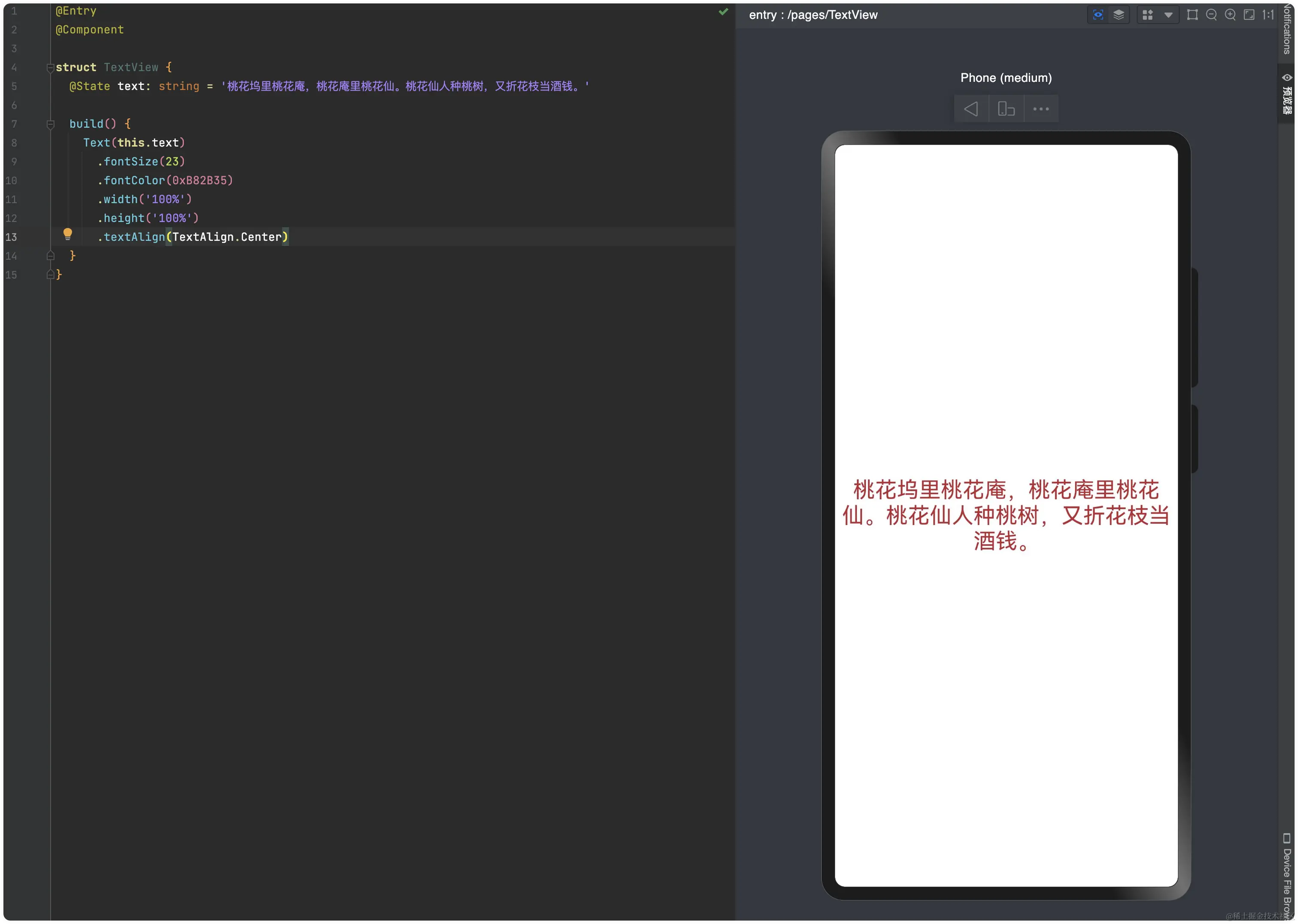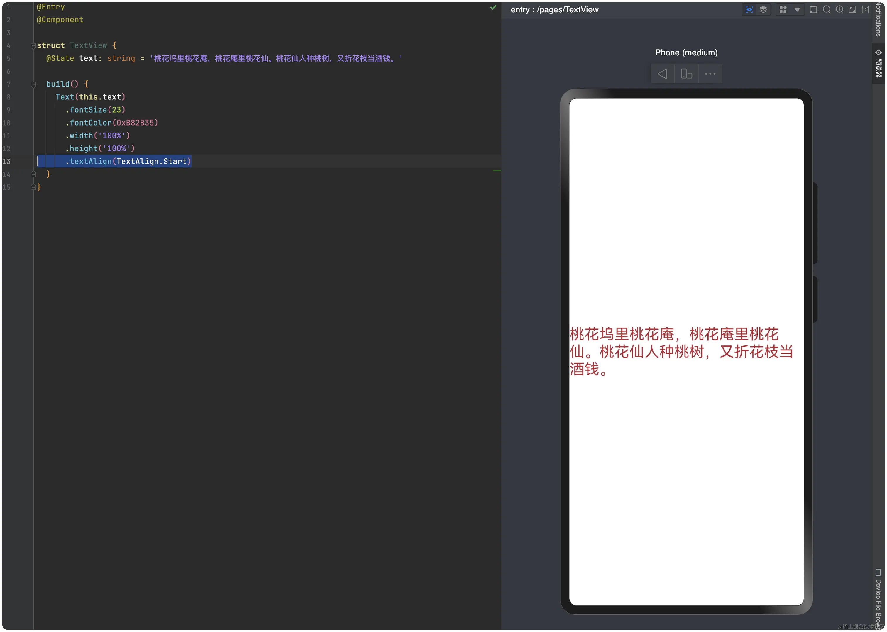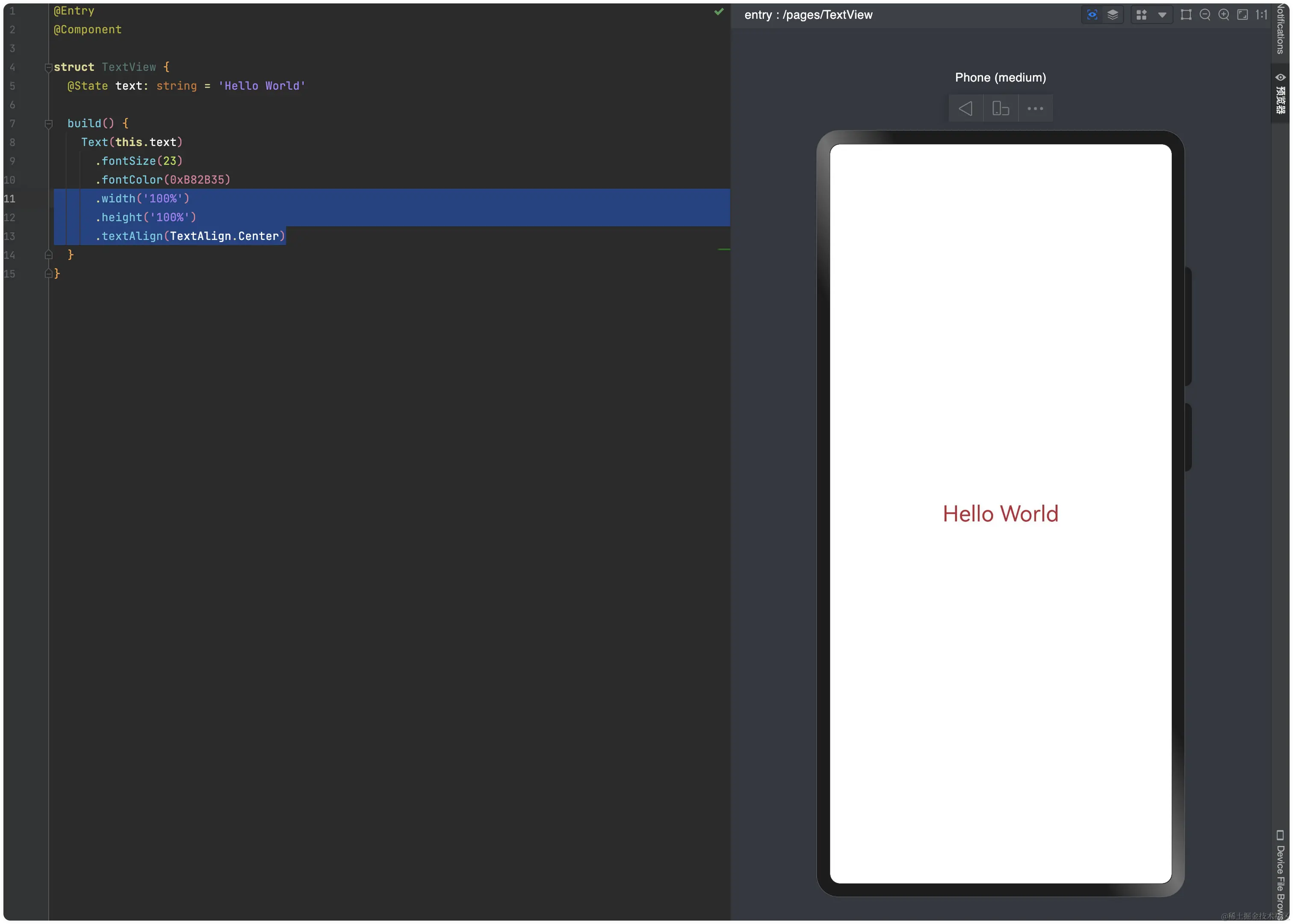 我们发现在ArkUI中,UI组件默认位置是在预览窗口的左上角,说实话我会更习惯它居中显示。设置居中对齐也比较简单,我们设置Text视图的宽高为整个屏幕的宽高,再设置文字对齐为居中对齐,如下代码所示: