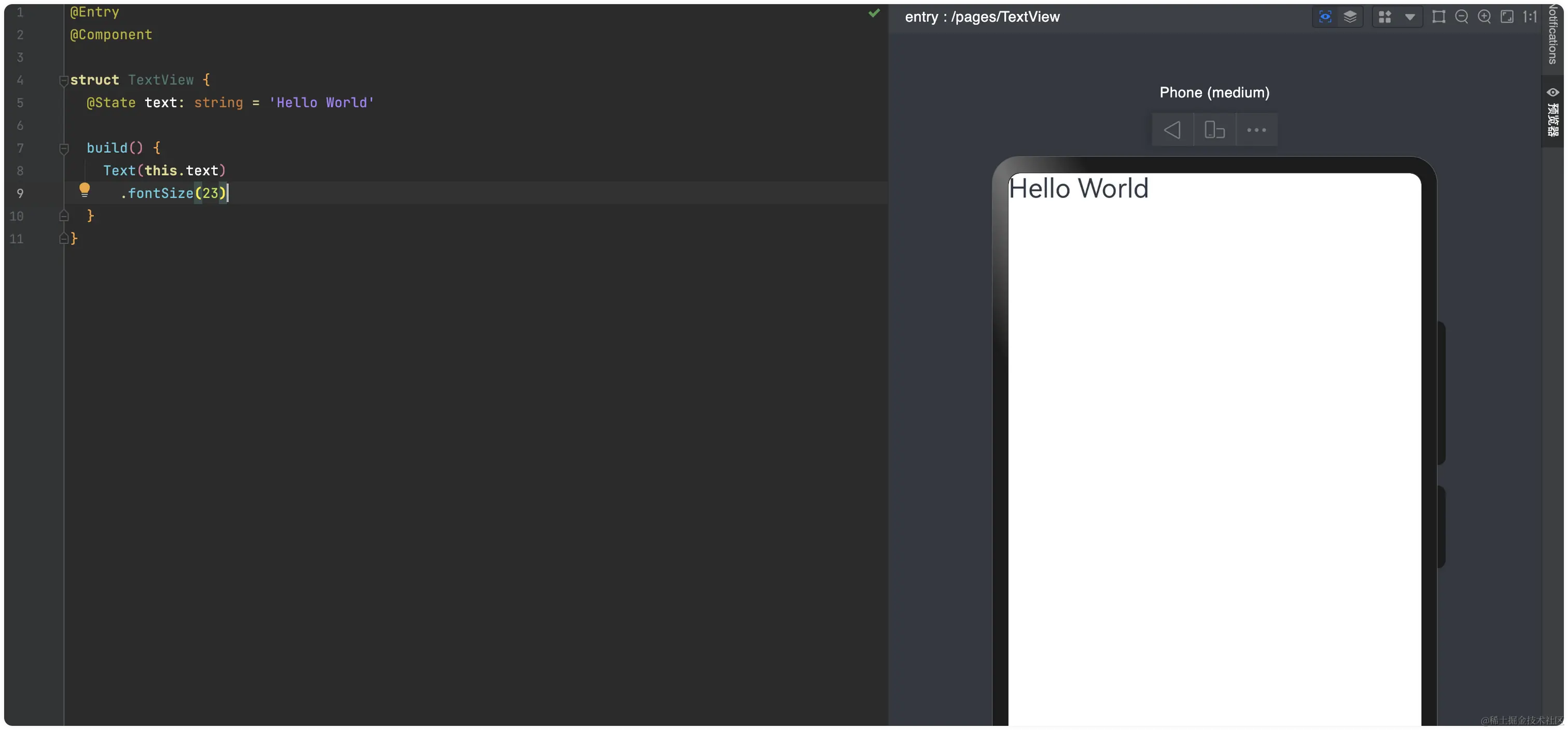 对于文本的美化,自然少不了专属的修饰器来帮忙,比如修改文字的大小,可以使用fontSize修饰器,如下代码所示: