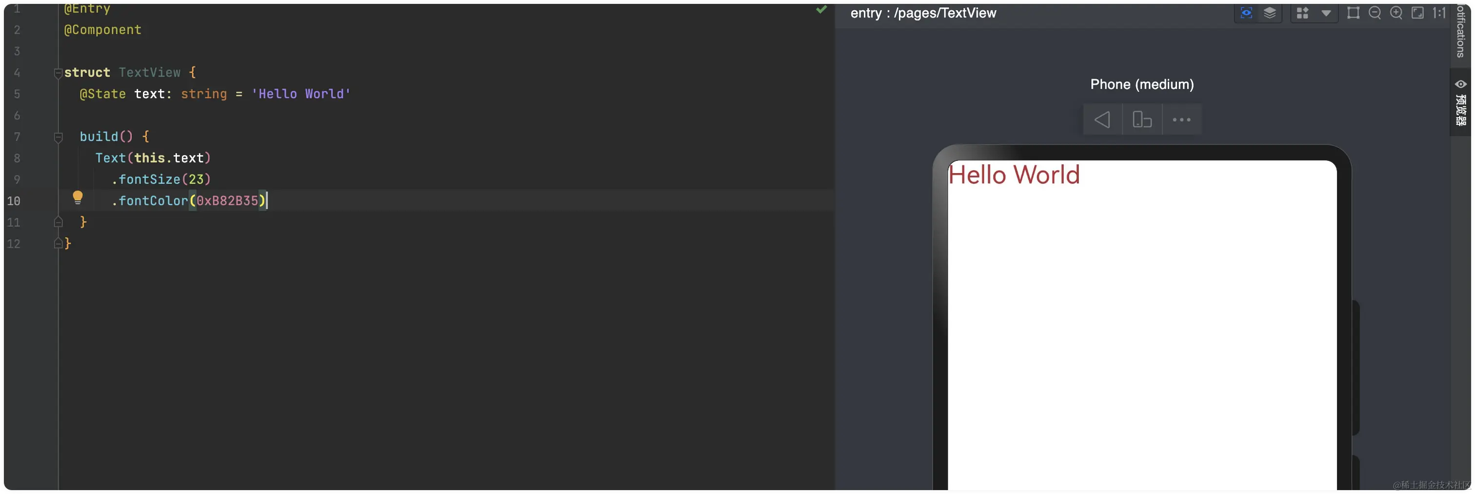 ArkTS似乎对于双引号和单引号没有那么“在意”,我们也可以使用Text视图中使用单引号来包裹内容,如下代码所示: