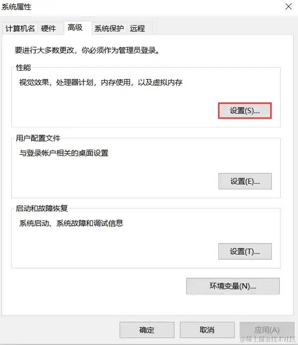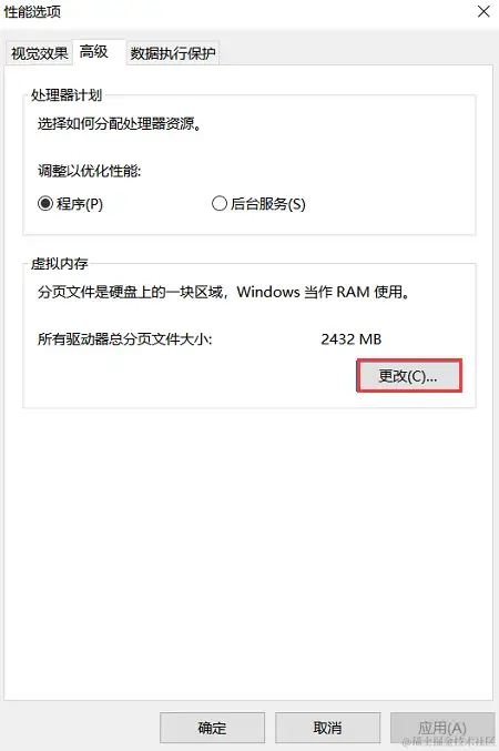 第二步:在高级选项卡中,点击 “性能” 下的“设置”按钮,在 “性能选项” 窗口中选择 “高级” 选项卡,点击 “更改” 按钮。