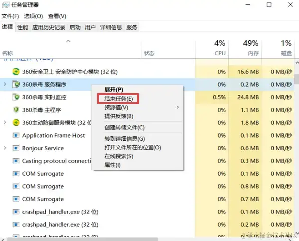 第三步:选中不需要的程序,点击 “结束任务” 按钮,关闭这些不必要的后台程序。