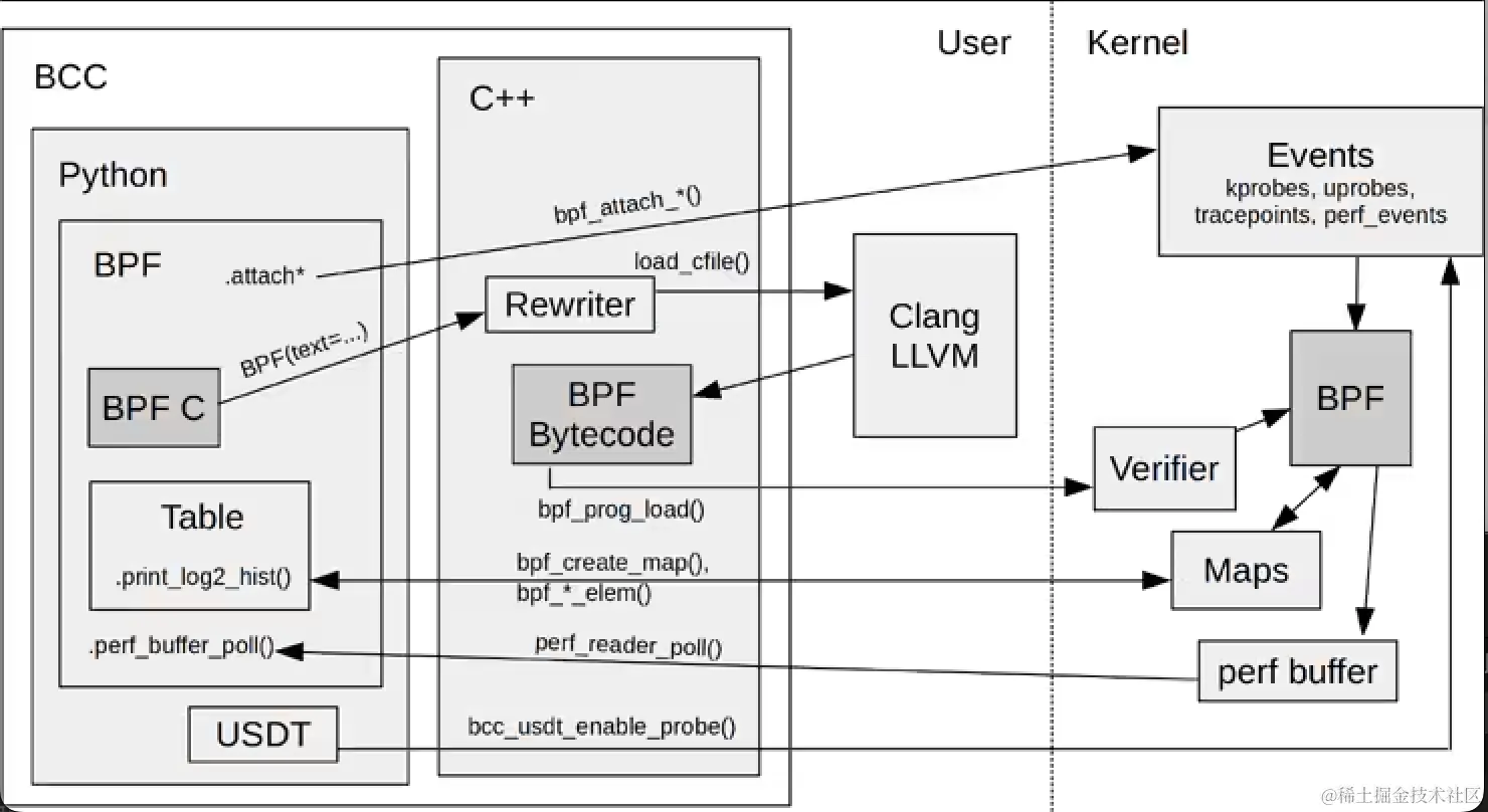 bpf 代码通过clang进行编译转成字节码,然后通过bpf syscall进行load和attach,在load阶段,内核bpf模块中的verifier会进行校验,检测 bpf 代码是否安全。