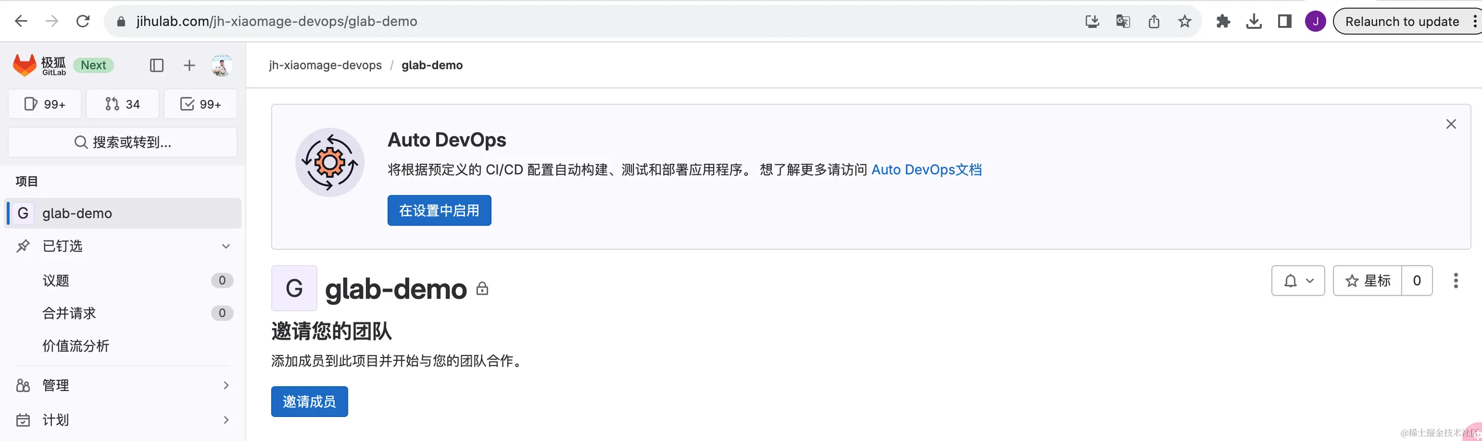 在极狐GitLab 实例页面上就可以看到创建好的项目了:
