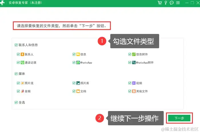 步骤2:连接完成后,在电脑最新页面勾选需要恢复的文件类型,或者全选,点击下一步,使软件扫描设备信息。为避免恢复过程中断,建议在扫描结束之后再进行恢复操作。