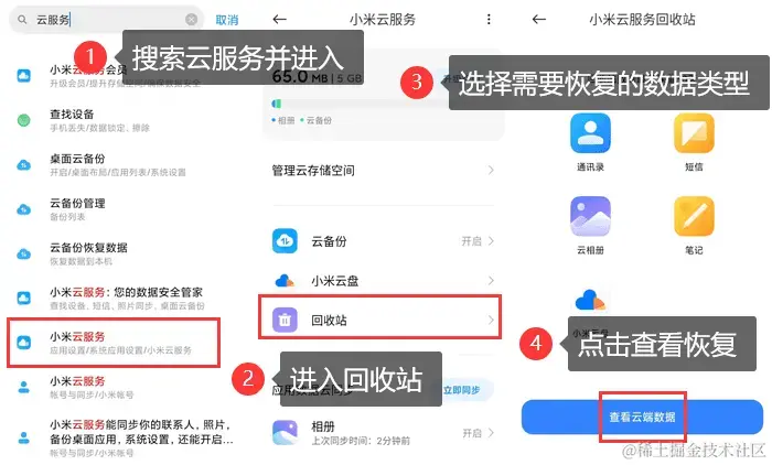 步骤2:在云备份中找到回收站,进入后查看云端存储,找到需要恢复的手机数据点击恢复即可。