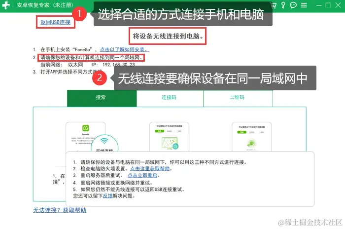 步骤1:电脑上下载最新版本的【数据蛙安卓恢复专家】APP,根据向导提示在手机上下载相应程序,然后连接手机和电脑。