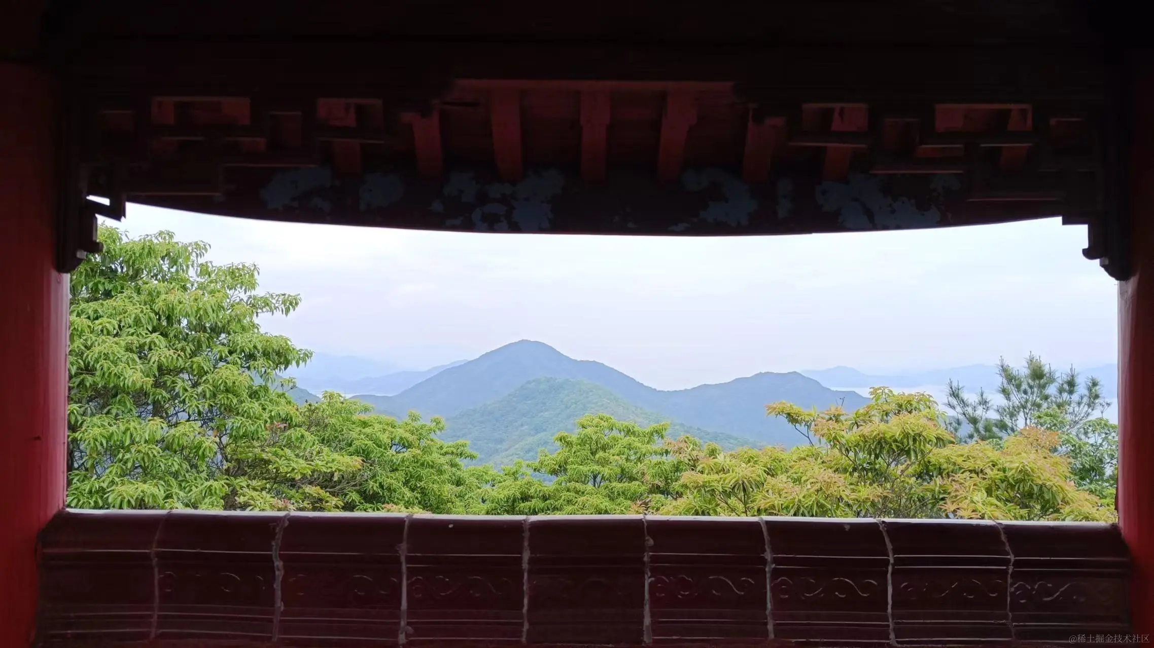 从山脚下爬到山顶,大约花了一个小时,山顶比较平缓,建有休息的凉亭,继续向前,有一座红色的八角亭,亭子里有木梯,拾级而上可以到达顶层观景平台,这个平台居高临下,四面的景色一览无余。站在亭内往外看就像一幅画,亭子的一部分正好构成了画框,而画的内容就是这绝美的风景