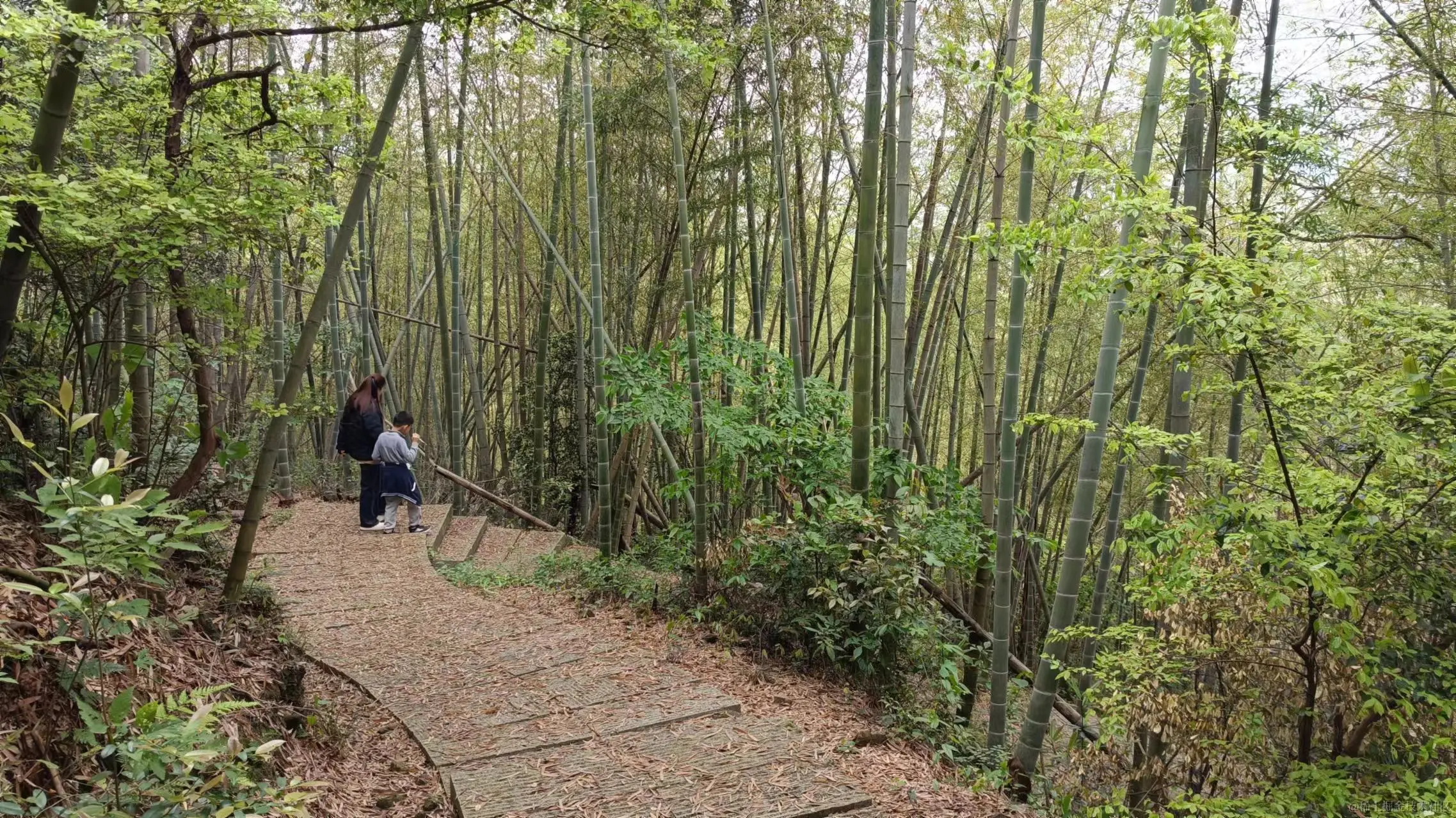 下山途中发现靠近山顶的位置都种植了树木,而山腰往下则是大片竹林,步道也不再是直上直下,而是迂回折返,从地上落满的竹叶可以看出,山上确实少有人来,而我们跑了几百公里,来到这个位于小山村旁的小公园爬山,也是玩儿的不亦乐乎