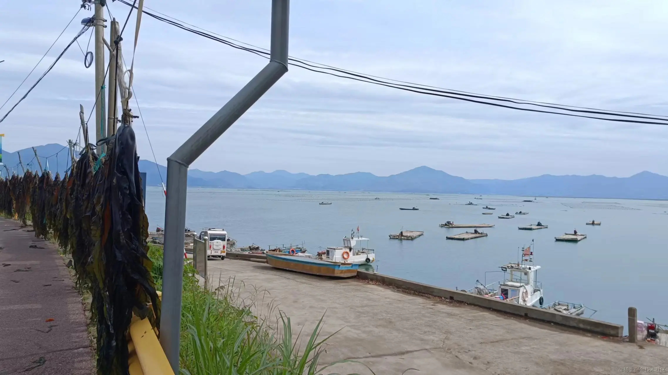 这一带应该是海带养殖基地,沿途道路两旁随处可见海带晾晒场,一排排的海带整齐的挂在晾晒架上,也是一道独特的风景线。一个转弯的位置风景极好