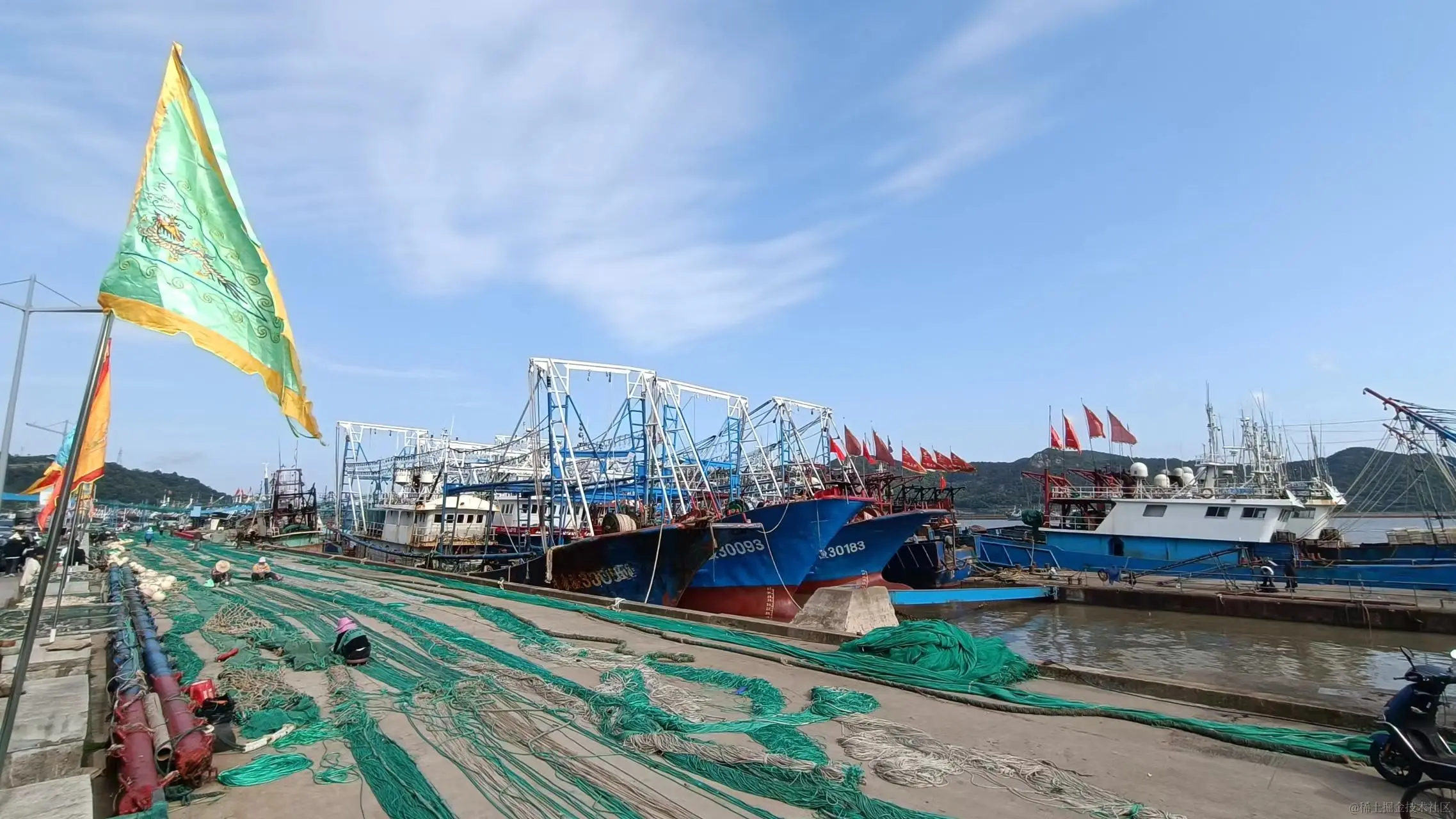 毕竟是浙江渔业第一村,全村80%以上青壮年从事海洋捕捞业,村子边上的港口停满了渔船,船内有叮叮咣咣修补的声音,岸边则有渔民在编者着渔网,这场景也只有沿海的渔港才能看的到