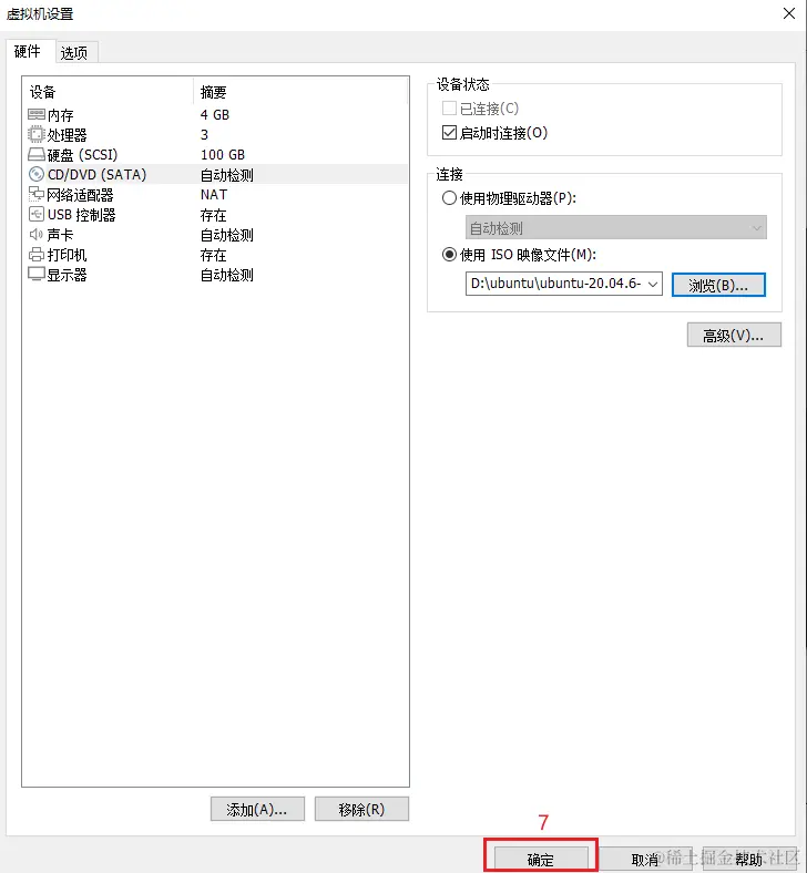 - 点击7处的确定,这样就把虚拟机的ubuntu镜像文件设置成功了。