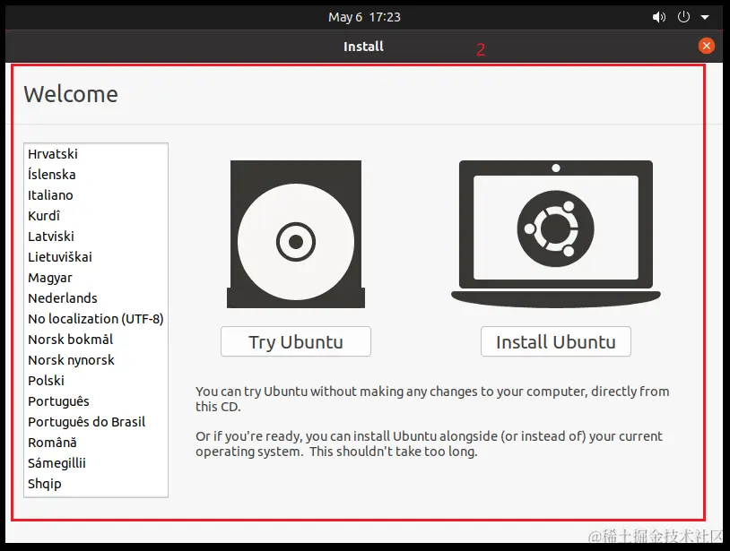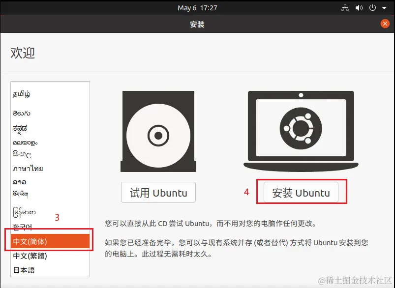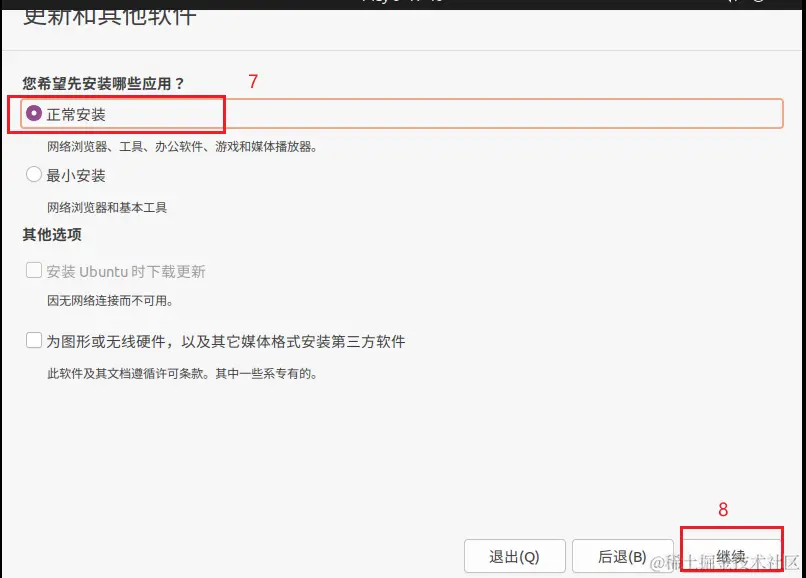 - 请注意,如果你看不到5处的继续,请左手按住键盘上6处的键的同时,右手按住鼠标的左键不放,向上拖动ubuntu的安装界面,直到可以看到5处的继续。