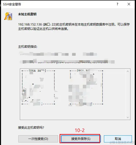 - 此时发现会弹出SSH安全警告弹框,点击10-2处的接受并保存。