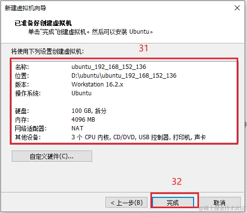 - 请注意31处的内容,这就是虚拟机的最终配置,包含了在前面设置的名称、位置、操作系统、硬盘、内存、网络适配器等信息。