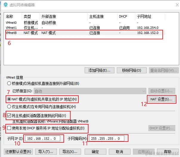 如果不点击5处,那么VMnet8的子网IP和子网掩码是灰色的,不能进行更改。
