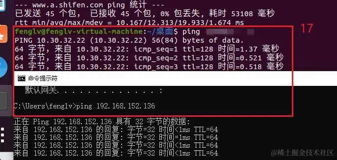 - 此刻ubuntu和本地的实体机之间可以互相ping通,如17处所示。