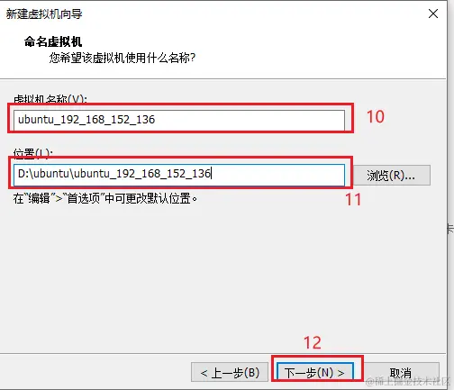 - 在11处填写虚拟机将要安装的目录,比如我填写的是D:\ubuntu\ubuntu_192_168_152_136。