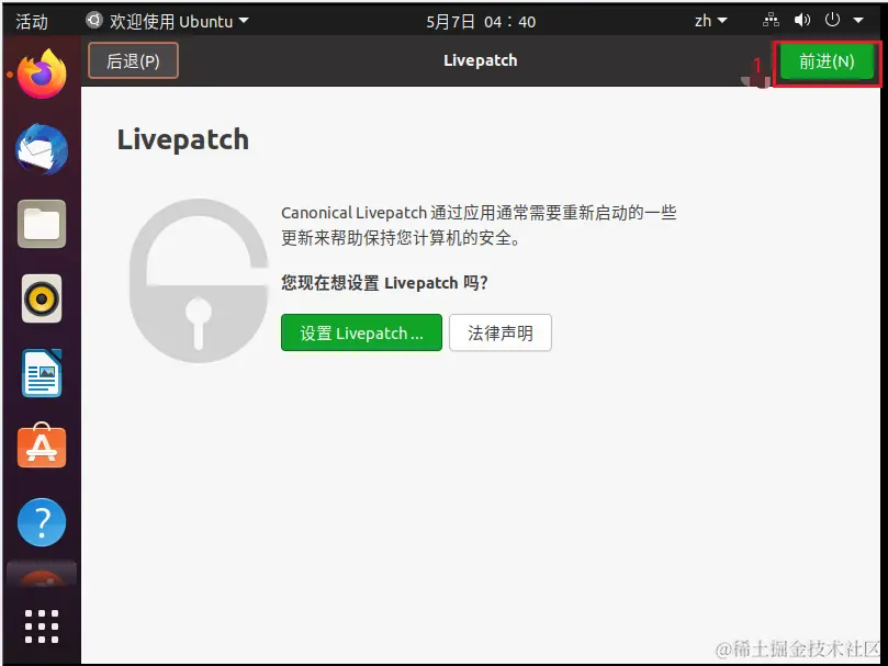 - 登录到ubuntu系统之后,会进入Livepatch的设置,点击1处的前进。
