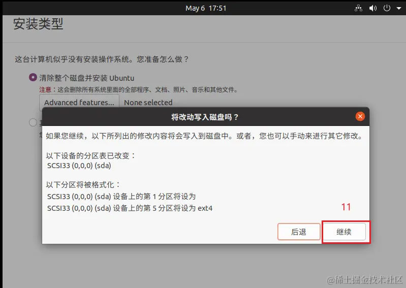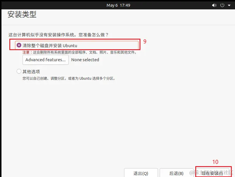 - 勾选9处的清除整个磁盘并安装Ubuntu。